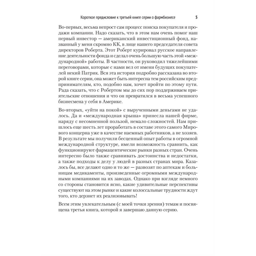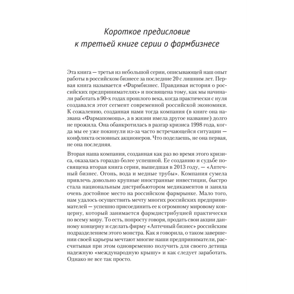 Хотите ли вы узнать реальную историю о российских предпринимателях и о том, как практически с нуля создавались сегменты современной российской экономики? Данное издание — третье из серии, описывающей особенности ведения бизнеса в России за последние двадцать лет. Приведя в пример одну из лучших российских дистрибьюторских компаний на фармацевтическом рынке, автор рассказывает о ее работе в составе грандиозной всемирно известной корпорации и превращении в российское подразделение огромного монстра. Вы узнаете, как российский бизнес адаптировался к мировым правилам игры и как мировой бизнес адаптировался к России. Может быть, многих это удивит, но далеко не всегда оказывалось, что «отсталой» России надо догонять «передовую» Европу. Очень часто получалось наоборот! Книга адресована всем желающим стать профессиональными управленцами или начать свой бизнес, а также будет полезна тем, кто интересуется историей и особенностями развития бизнеса в России.