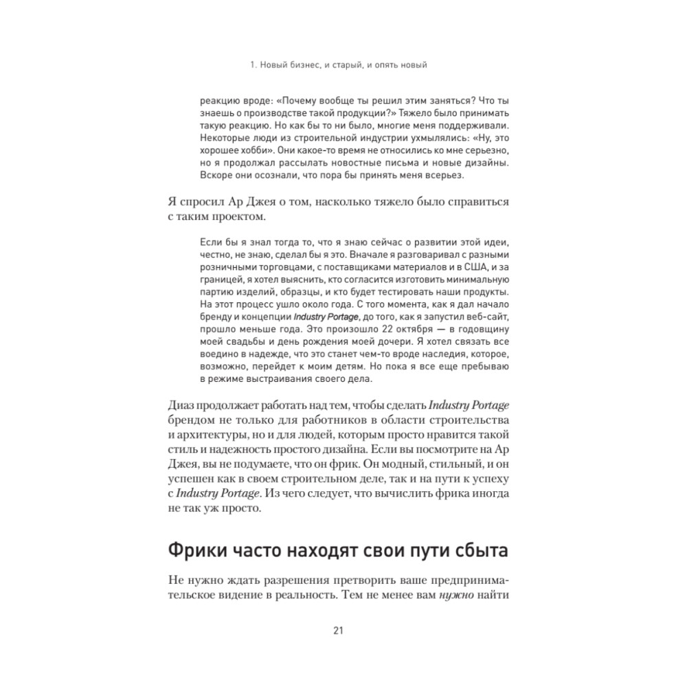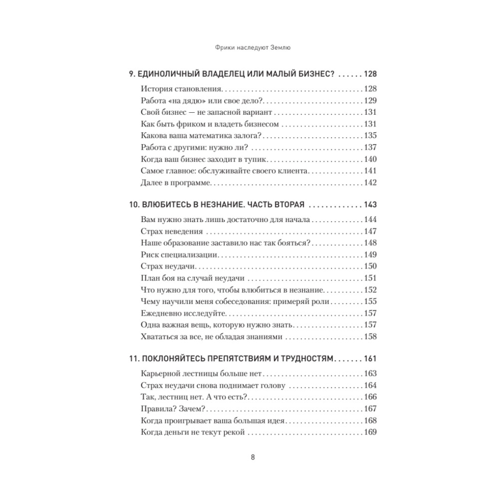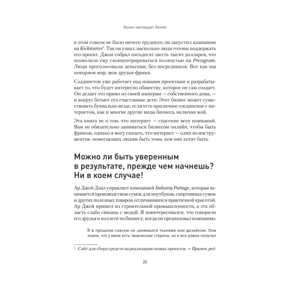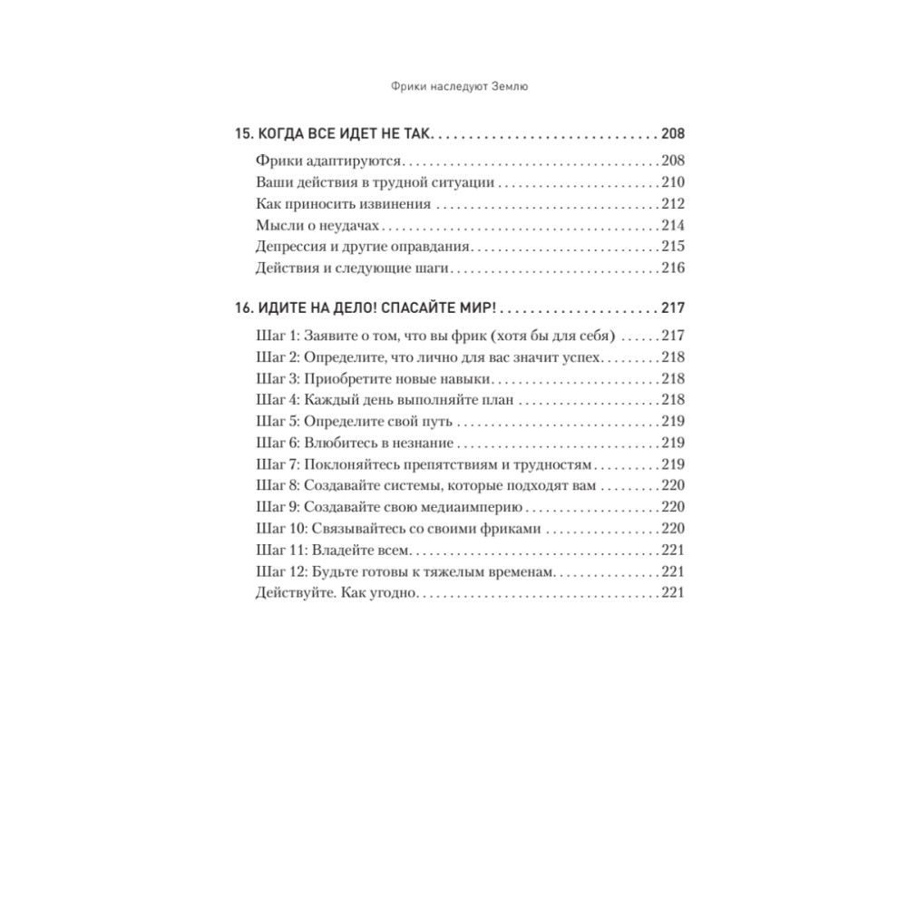 Одно из важнейших посланий автора: в старые времена нужно было приспосабливаться, но теперь нужно просто рассмотреть варианты и выбрать то, что вам кажется правильнее всего. Стройте планы и следуйте им. Пытайтесь, а если не получается, пробуйте еще и еще. И побеждайте. Освойте путь, которым шли другие фрики — неординарные люди, умеющие жить и заниматься делом на своих условиях. Вы готовы к ним присоединиться? Вперед, фрики!