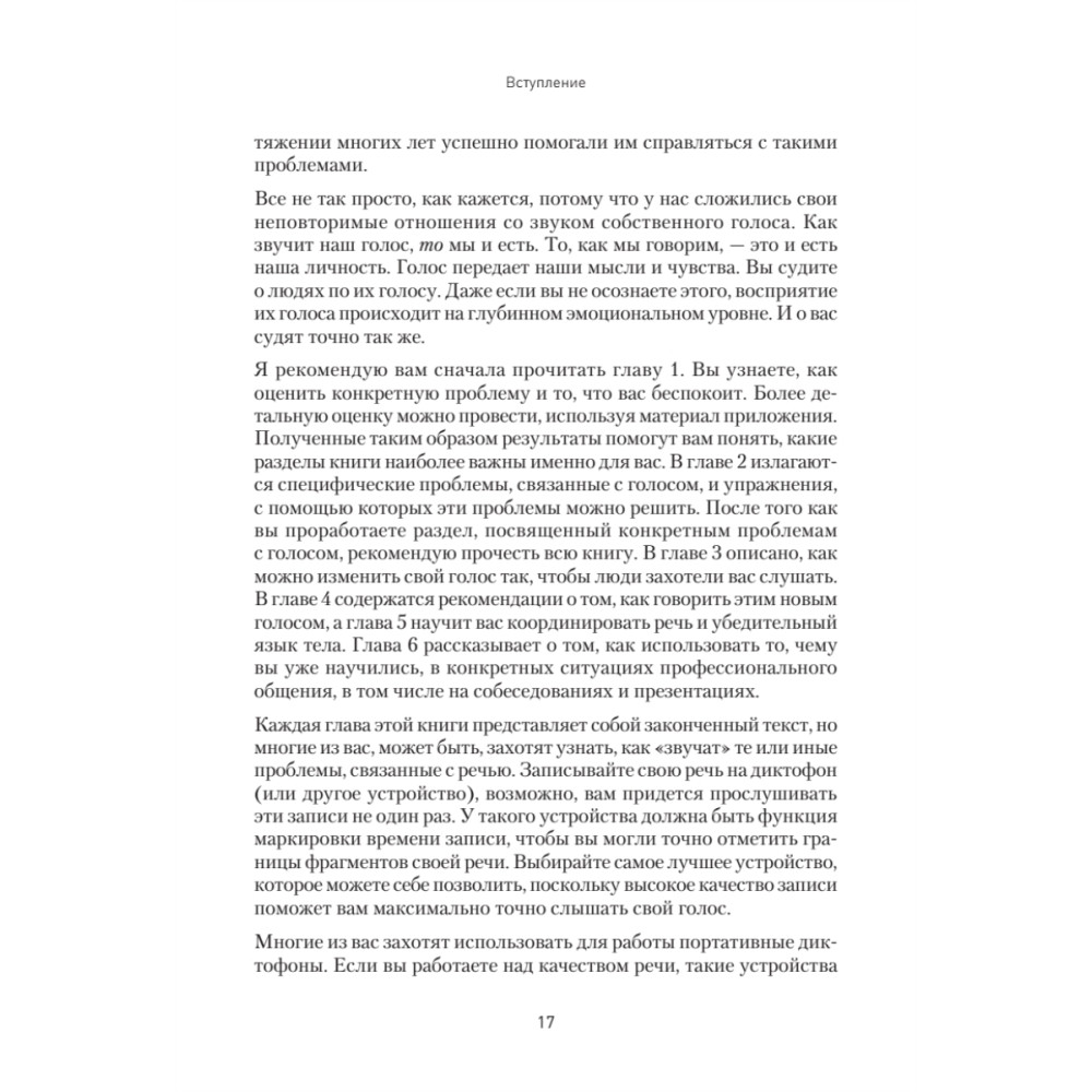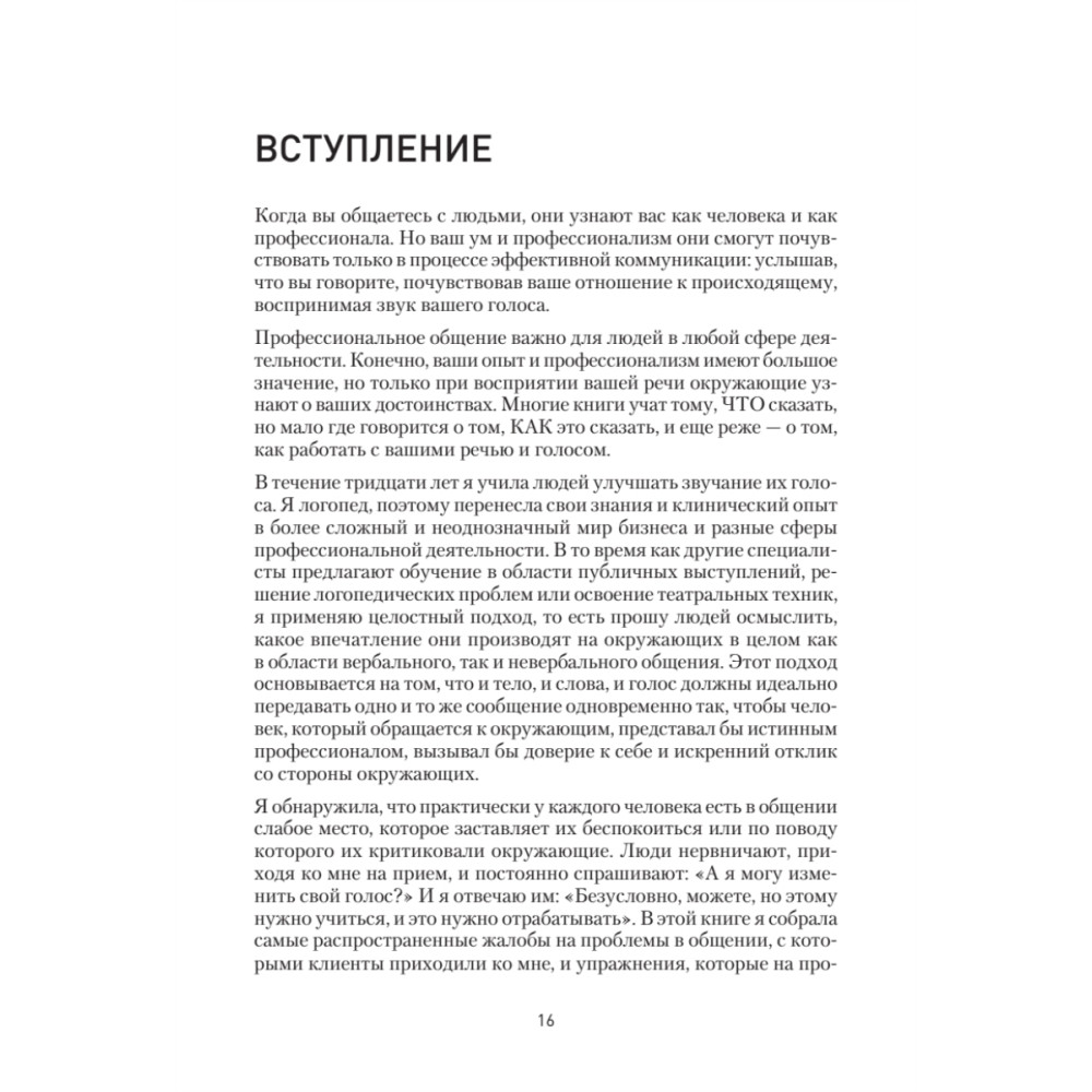 Издание адресовано широкому кругу читателей: узнайте, как изменить свой голос, чтобы люди захотели вас слушать, используйте полученные навыки на собеседованиях и презентациях. Также книга будет полезна профессионалам и предпринимателям: координируйте свою речь и убедительный язык тела, выполняйте короткие эффективные тренировки 3–4 раза в день в течение 6–20 минут, чтобы говорить свободно и раскованно.