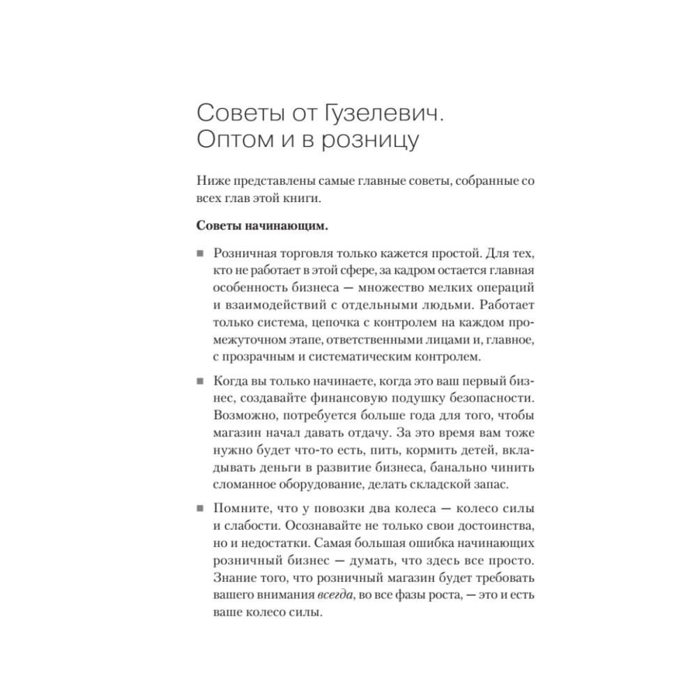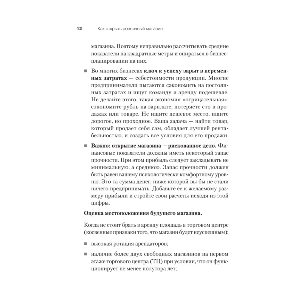 Здесь обобщен весь практический опыт автора, полученный более чем за 10 лет ведения различных розничных проектов, от гипермаркетов с залами 10 000 м2 до собственных магазинов островного формата площадью 5 м2. С первых строк вы увидите: в книге только опыт, никакой теории, ничего лишнего. Все основные аспекты деятельности магазина — от поиска и оценки места для будущего магазина, подбора персонала, формирования ассортимента до мерчандайзинга на полках и пресечения краж. Здесь именно то, что убережет вас от ошибок, финансовых потерь и поможет создать успешный и прибыльный проект — возможно, ваш первый, возможно, ваш собственный магазин.