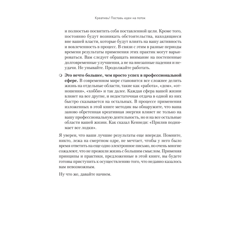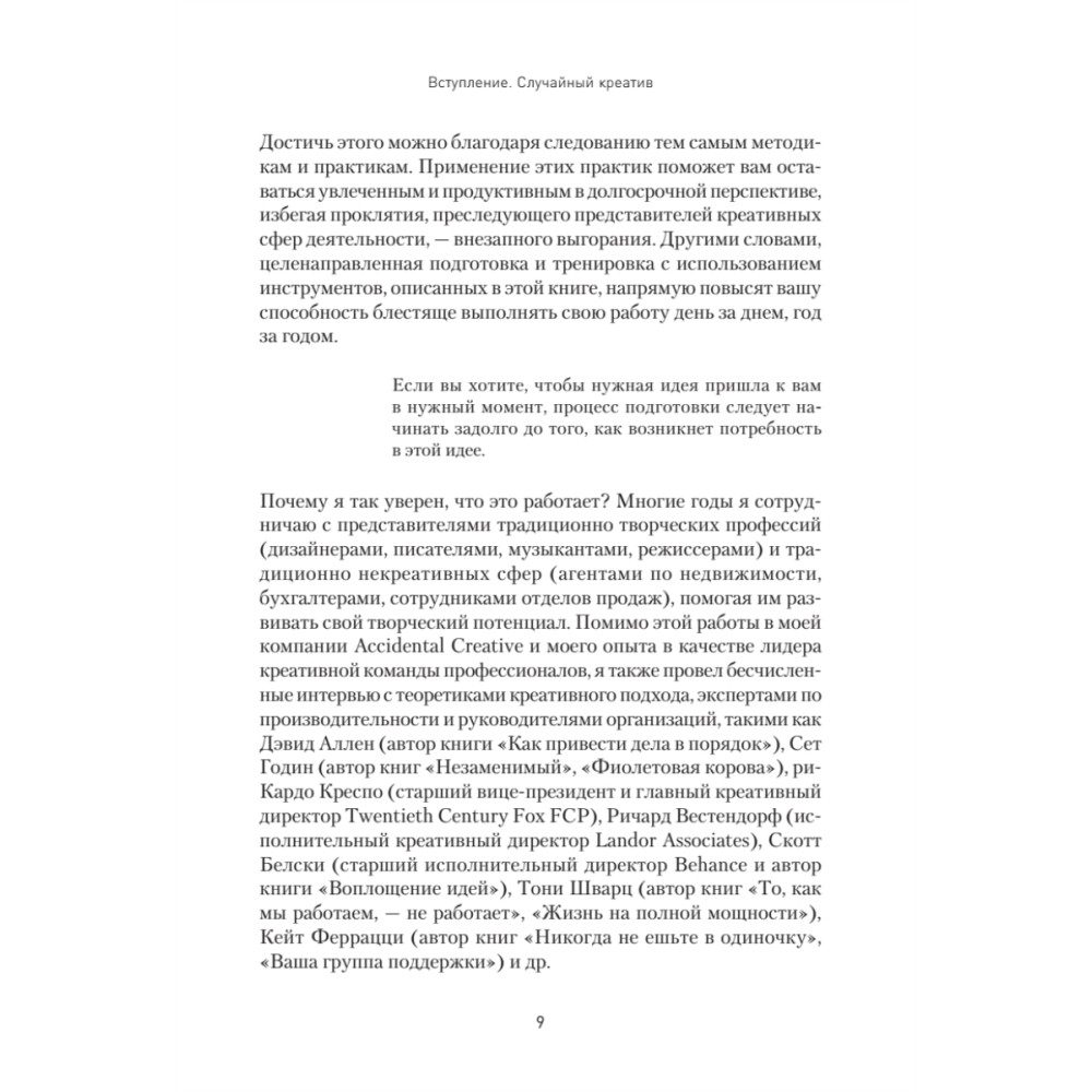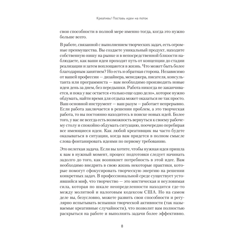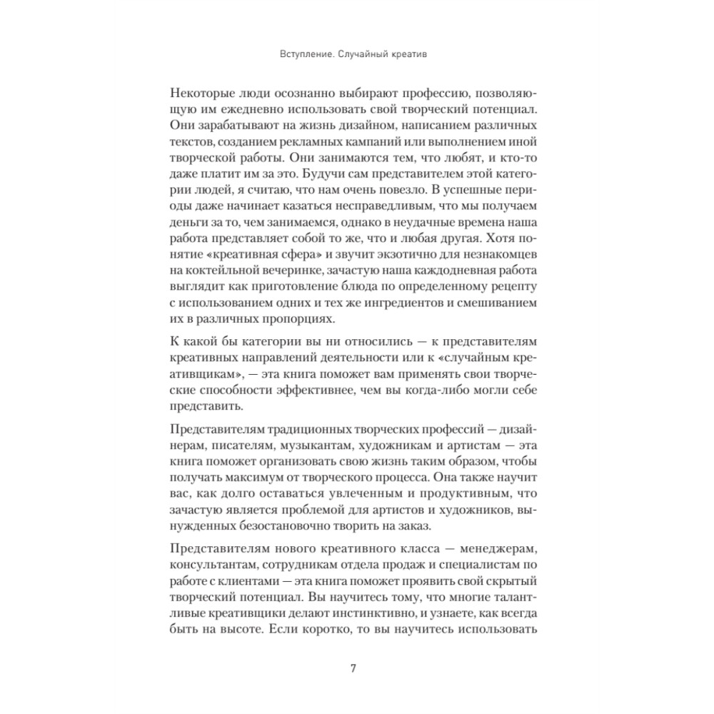 Предложенные методы действительно работают, ведь в основу книги положена многолетняя практика консультирования представителей творческих профессий (дизайнеров, писателей и музыкантов), а также совершенно нетворческих (продавцов, агентов по недвижимости, бухгалтеров). В дополнение к этому проведены бесчисленные интервью с руководителями компаний и экспертами по производительности.