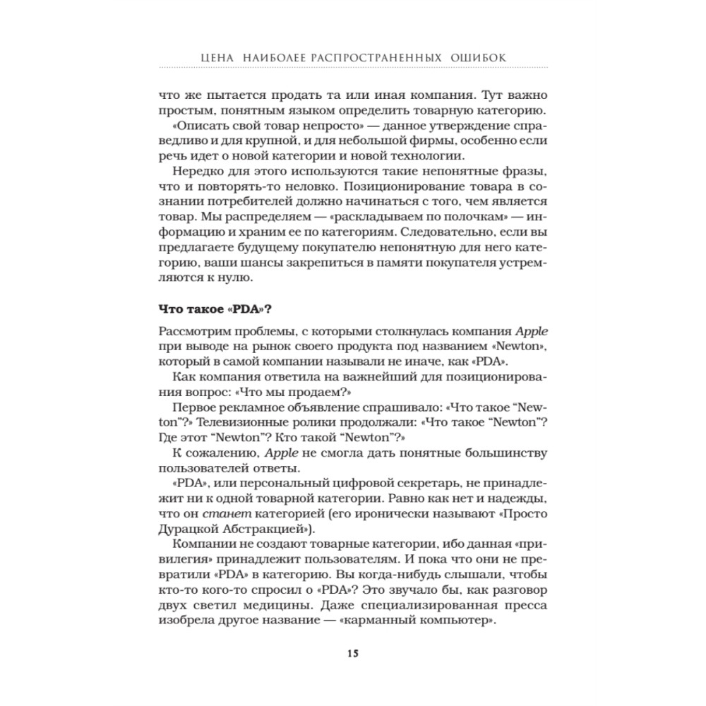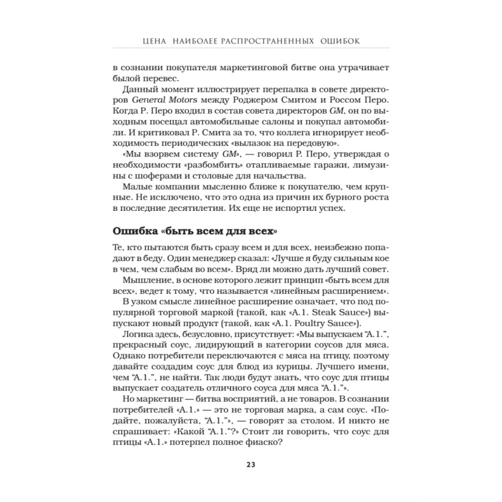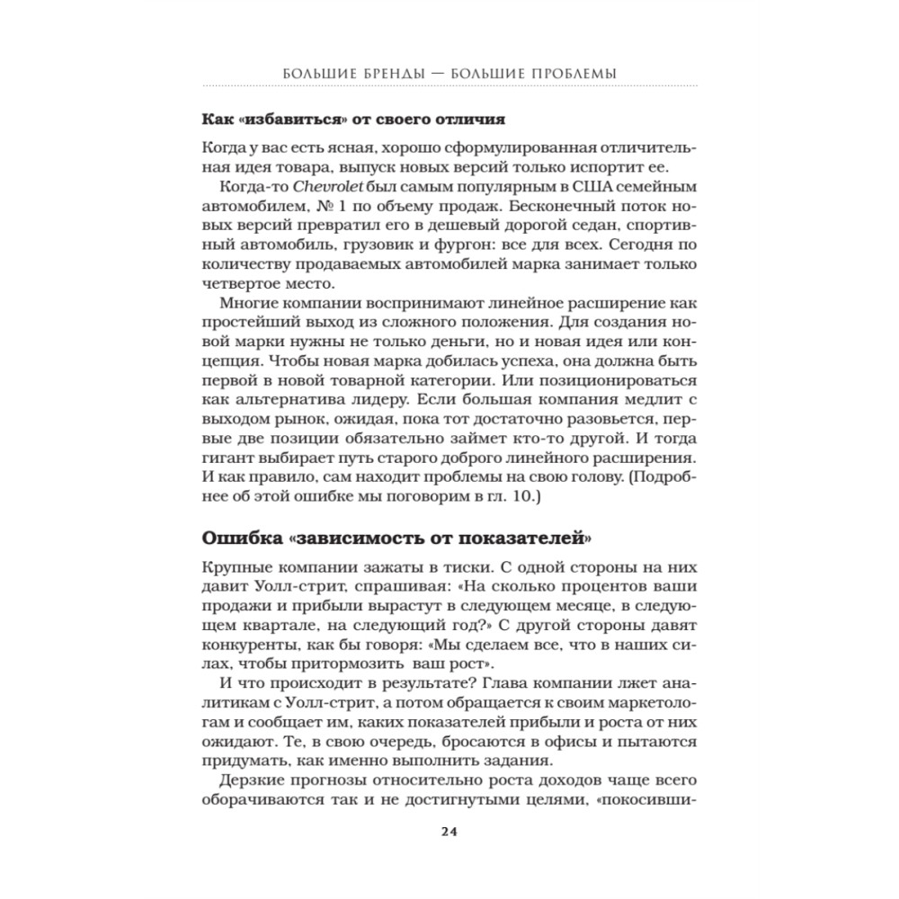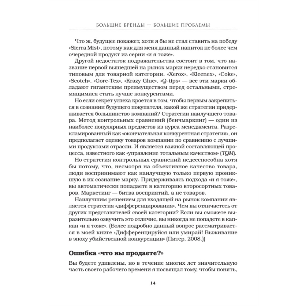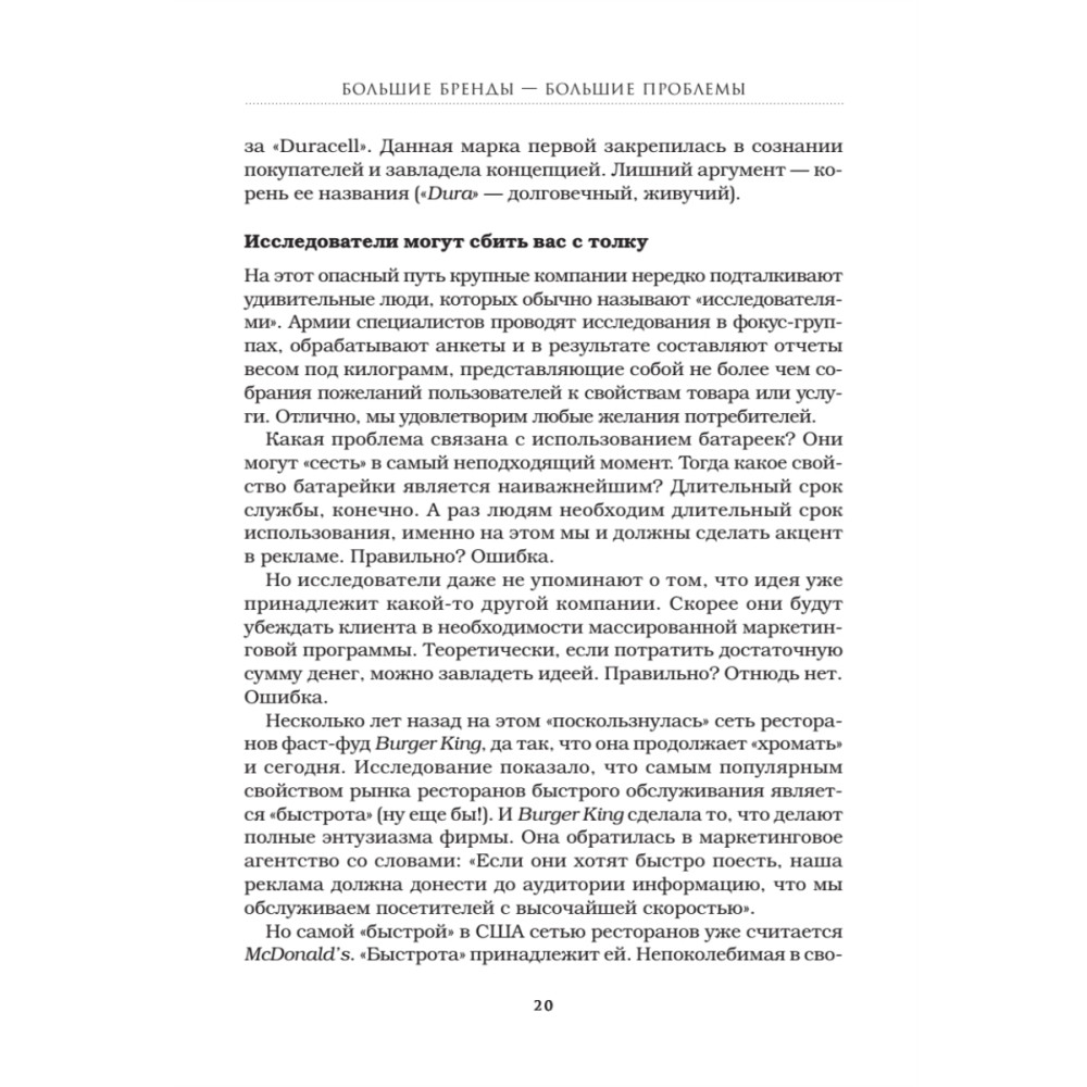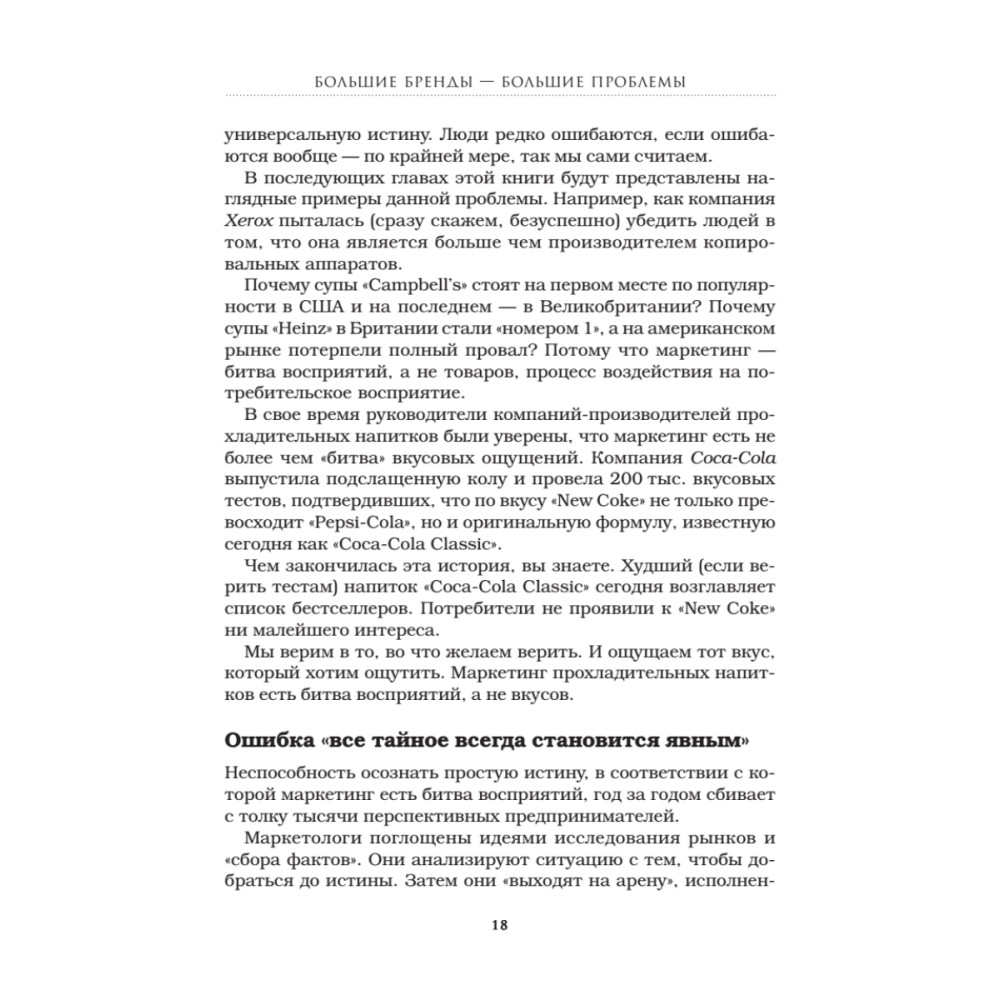 Утверждение «Маленькие дети — маленькие проблемы, большие дети — большие проблемы» справедливо и в отношении торговых марок. В известных и раскрученных брендах есть не только положительные стороны, но и множество подводных камней. «Король позиционирования» Джек Траут рассказывает о катастрофических маркетинговых и стратегических ошибках, из-за которых пострадали фирмы, долгое время бывшие лидерами на рынке, и показывает, как можно было избежать проблем. Приводится множество примеров из опыта таких компаний, как Xerox, Levi's, Miller Brewing, Digital Equipment, Burger King и других. Издание будет полезно маркетологам, бренд-менеджерам, директорам по развитию, владельцам и управляющим компаниями.