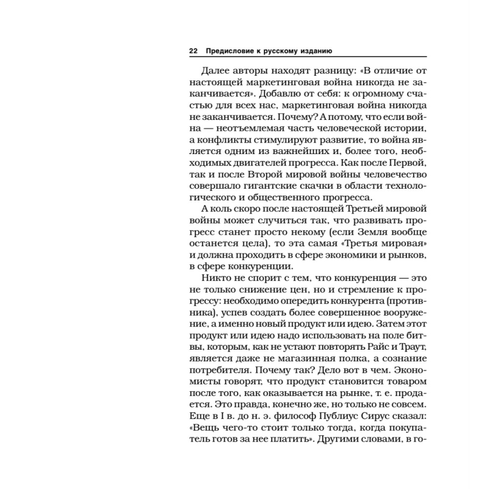 «Маркетинговые войны» издаются и пользуются популярностью уже целых 20 лет. Едва ли не с первого дня выхода в свет (в 1986 г.) книга стала настольным пособием для сотен тысяч профессионалов во всем мире. Сегодня невозможно найти специалиста по маркетингу, руководителя компании или менеджера, который бы не проштудировал ее. Как не найти и серьезной работы по маркетингу, в которой бы авторы не ссылались на «Маркетинговые войны».