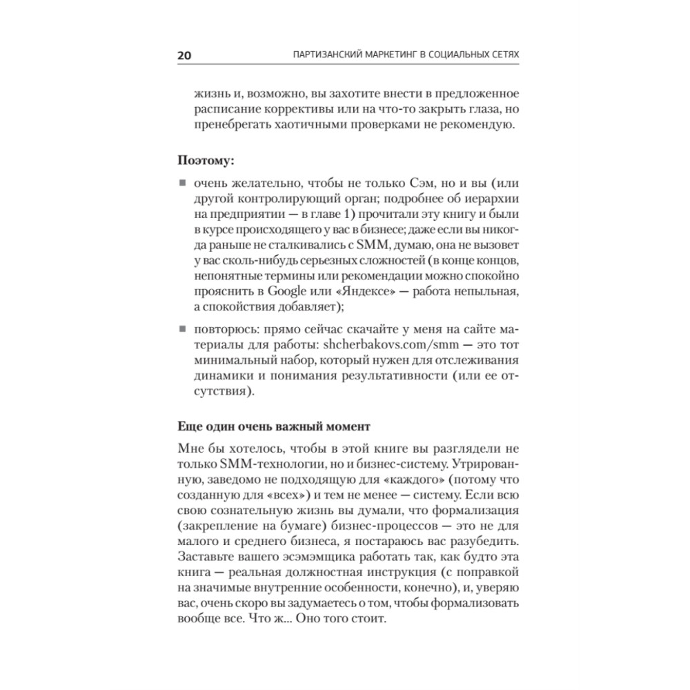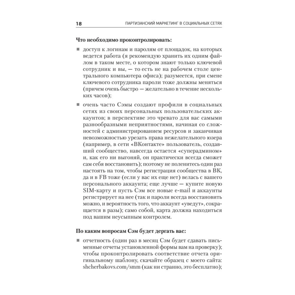 Эта книга по сути — вовсе не книга, а скорее должностная инструкция, которая призвана регламентировать профессиональную жизнь SMM-менеджера даже за пределами трудодня. В ней буквально почасовое расписание задач на неделю (вопрос «Что?») сменяется полноценным «Как?» и лишь в необходимых случаях «Зачем?».