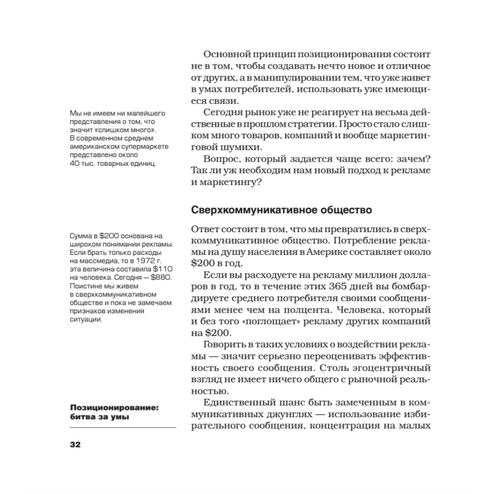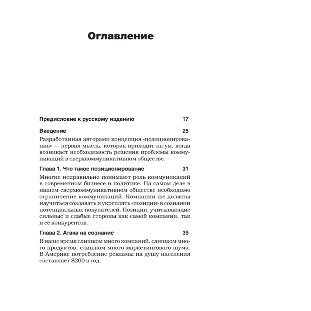 Новейшее издание книги дополнено авторскими комментариями, в которых анализируются феноменальные успехи и грандиозные маркетинговые провалы трех последних десятилетий, а также кейсами из практики рекламы и маркетинга в России, написанными по согласованию с Джеком Траутом российскими представителями компании Trout&Partners.