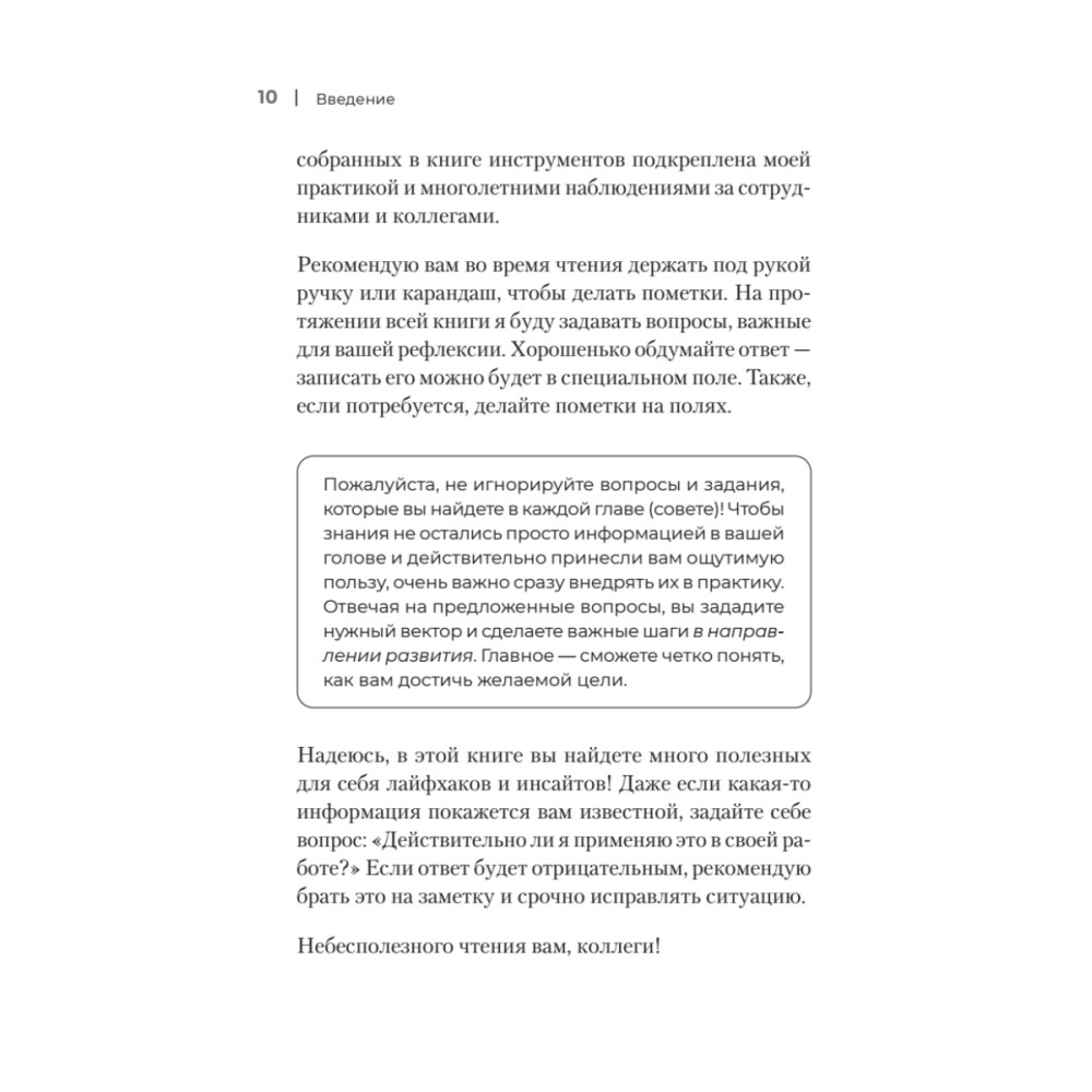 Каждый инструмент и подход, предложенный автором, был протестирован на практике. В книге вы найдете: вопросы для рефлексии, чтобы глубже понять свои цели и переосмыслить управленческую практику, а также советы для максимальной продуктивности. Полезные лайфхаки и инсайты можно сразу применить в работе.