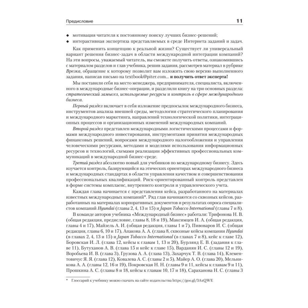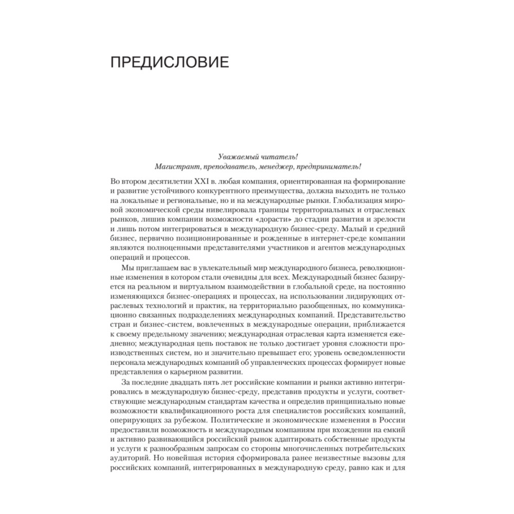 Книга представляет собой дальнейшее развитие широко известного в нашей стране учебника «Международный менеджмент», выдержавшего 5 изданий, и подготовлена тем же авторским коллективом (сотрудники кафедры международного бизнеса СПбГЭУ). Издание призвано сформировать комплексное представление о задачах, условиях и инструментах современной практики бизнеса в международной среде. Подробно описаны важнейшие вопросы международного бизнеса в целом, а также ресурсного обеспечения процессов реализации стратегических решений и способов контроля эффективности действий. Соответствуя в целом зарубежным образцам, книга ориентирована в первую очередь на российскую аудиторию: во-первых, главное внимание уделяется наиболее актуальным для российского бизнеса проблемам оперирования в международной среде; во-вторых, основой изложения являются крупноформатные кейсы, разработанные на материалах как известных международных компаний, так и нескольких оперирующих на зарубежных рынках российских компаний. Учебник рассчитан на подготовленных читателей, в том числе магистрантов и специалистов, вовлеченных в международный бизнес. Рекомендовано Методическим советом СПбГЭУ в качестве учебника для студентов, обучающихся по направлению подготовки 38.04.02 "Менеджмент" (квалификация "магистр").