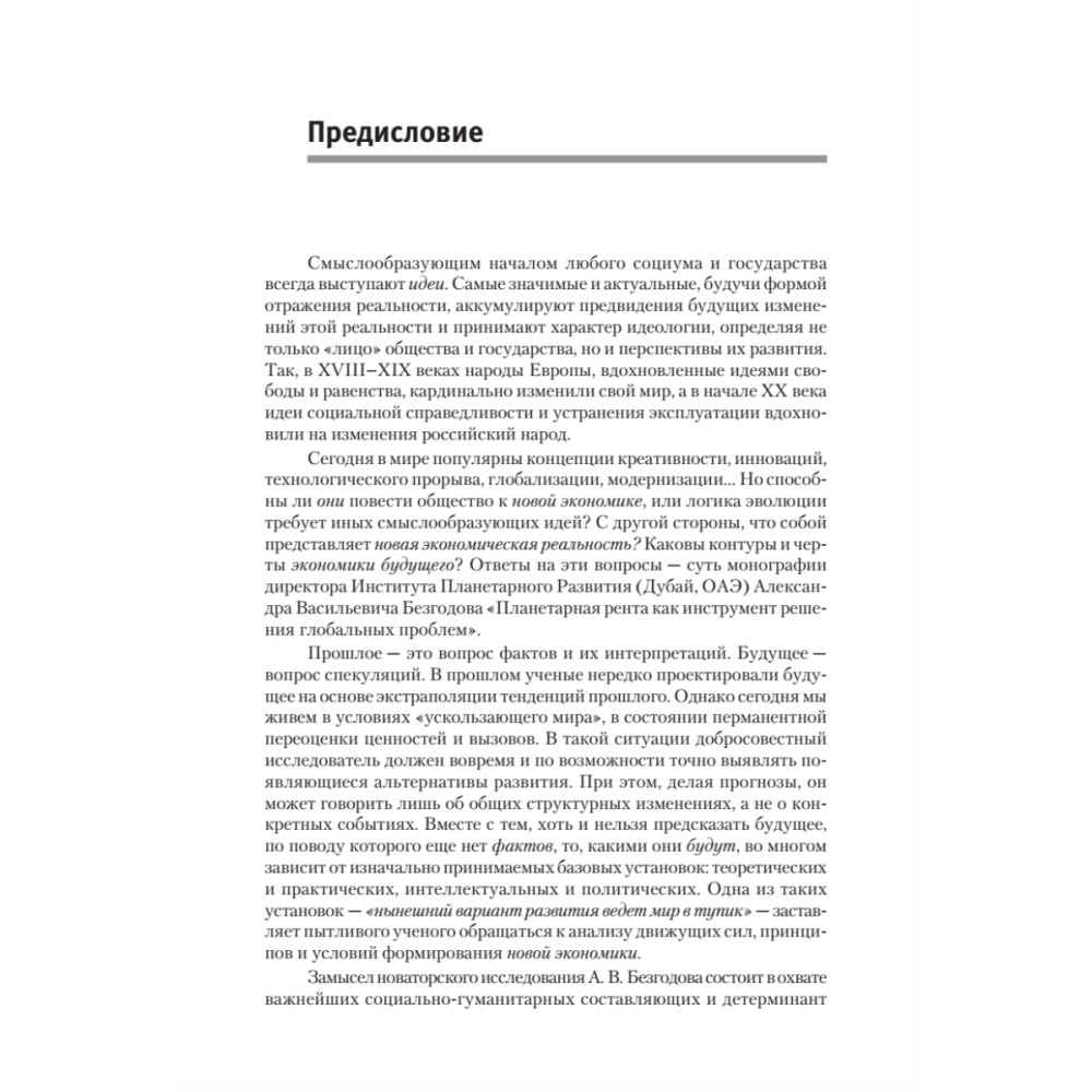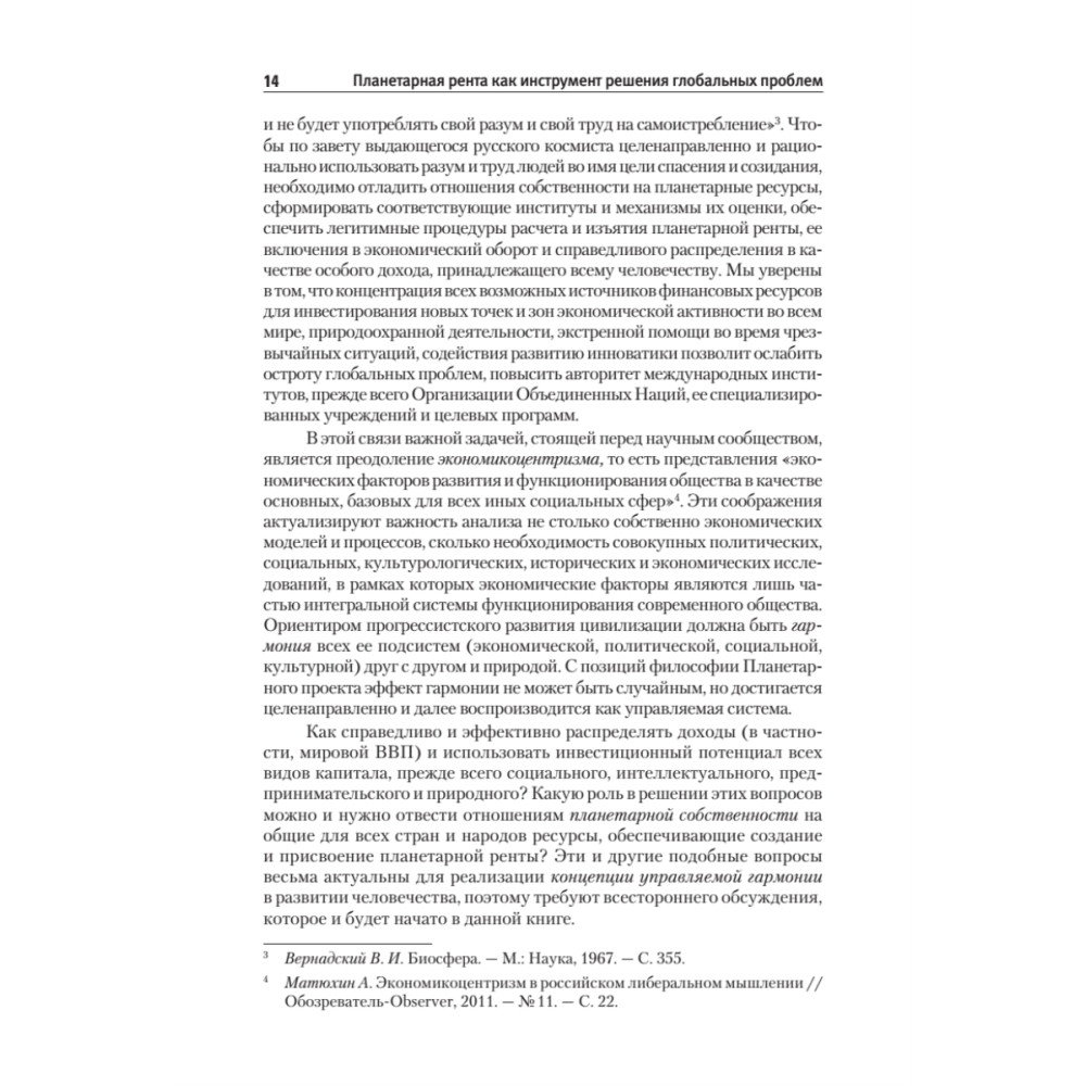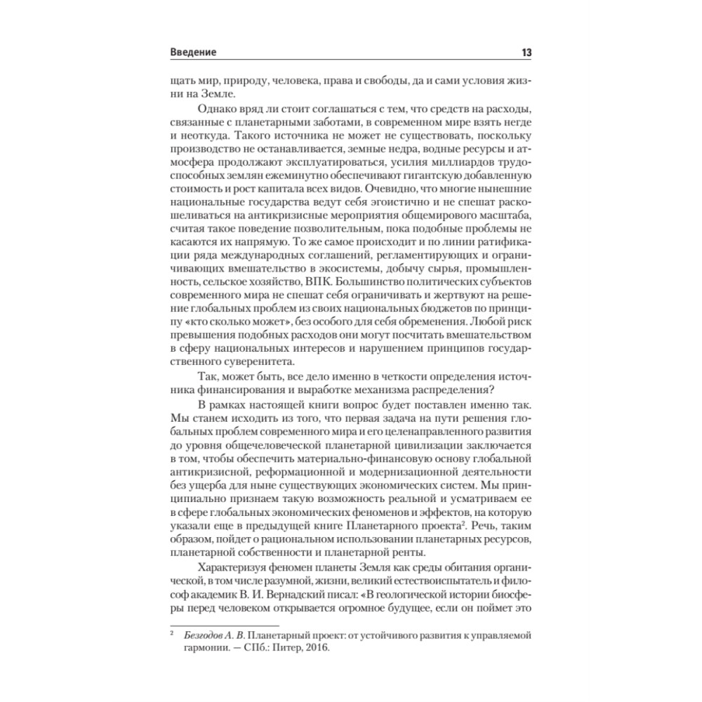 Авторская монография члена-корреспондента РАЕН, доктора экономических наук, генерального директора Института Планетарного Развития (Дубай, ОАЭ) А. В. Безгодова «Планетарная рента как инструмент решения глобальных проблем» посвящена экономическим механизмам реализации концепции управляемой гармонии. В монографии излагается инновационная теория планетарной ренты как инструмента формирования планетарного бюджета, на средства которого могут быть решены глобальные проблемы, заложены основы новой экономики, соответствующей требованиям биосовместимости и справедливости в распределении мирового дохода. Планетарная рента раскрывается как следующая историческая фаза развития института ренты, в которой будет снято заключающееся в ней противоречие, связанное с отчуждением избыточного дохода. Рассматриваются различные сценарии динамики мирового хозяйства, описывается модель планетарной экономики как результат перехода к биоцентричной парадигме человеческой деятельности и технологиям Шестого уклада, место и роль планетарной ренты в новой реальности.