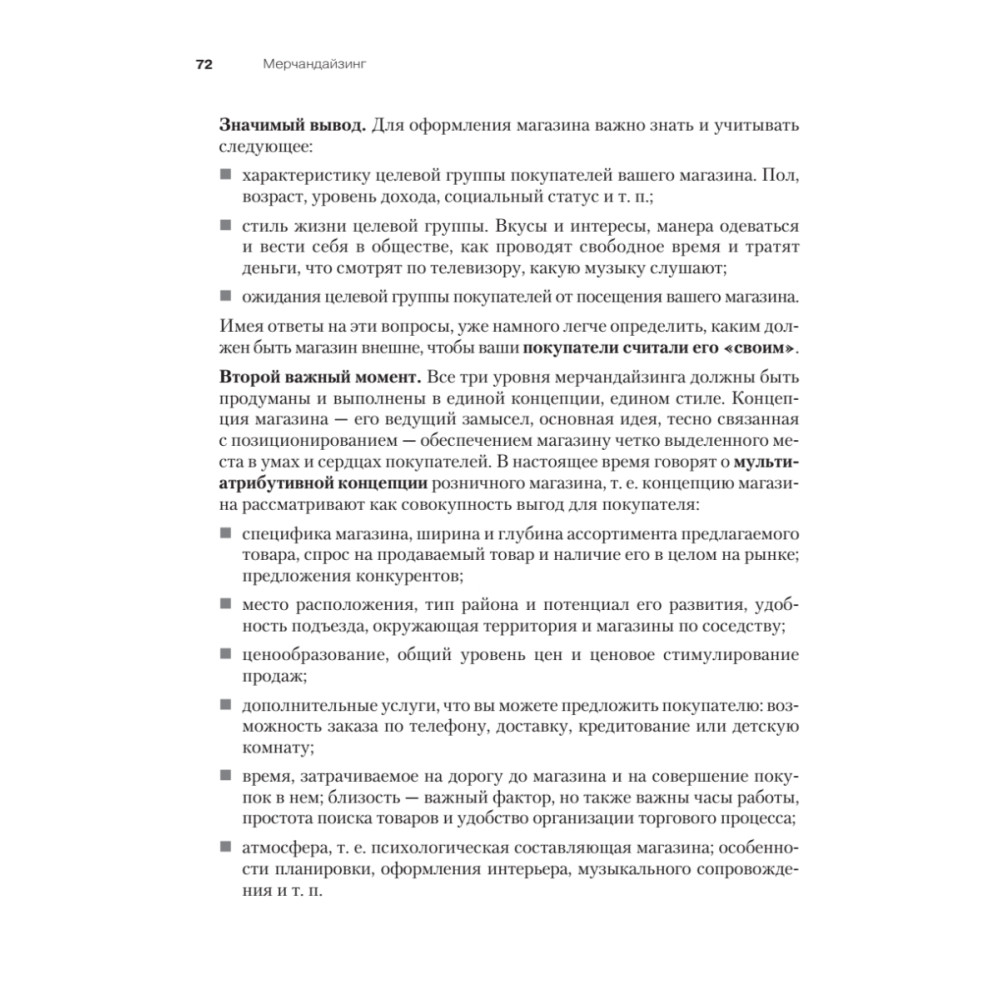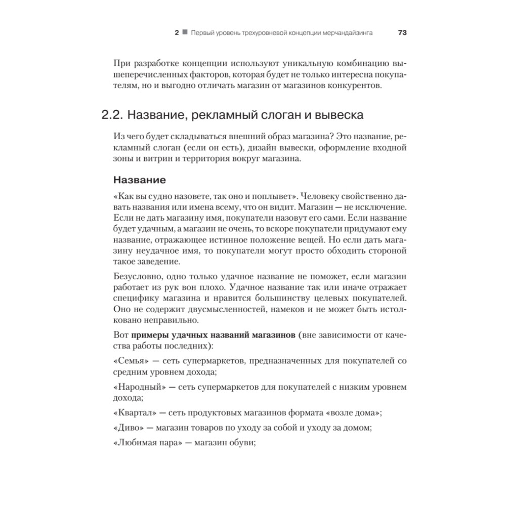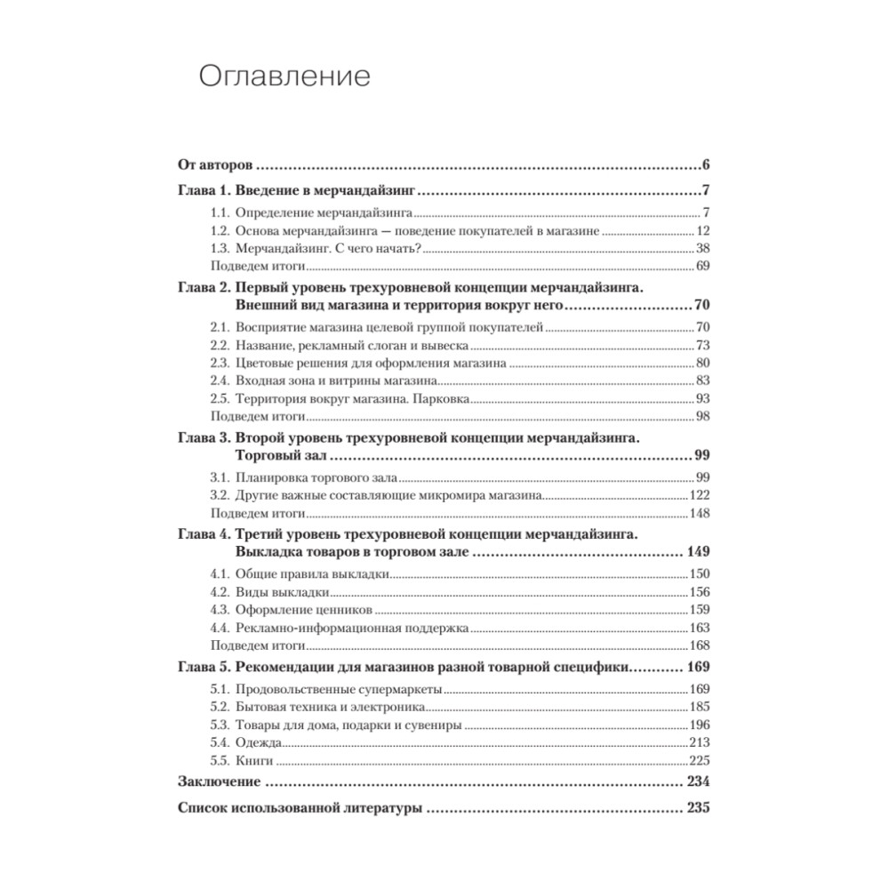 Материал излагается в соответствии с авторским определении мерчандайзинга - это комплекс мероприятий, проводимых в магазине для того, чтобы покупателям было удобно, приятно и выгодно совершать покупку. В этом ключе авторы подробно рассматривают трехуровневую систему мерчандайзинга – внешний вид магазина, пространство торгового зала и выкладка товара на полках.