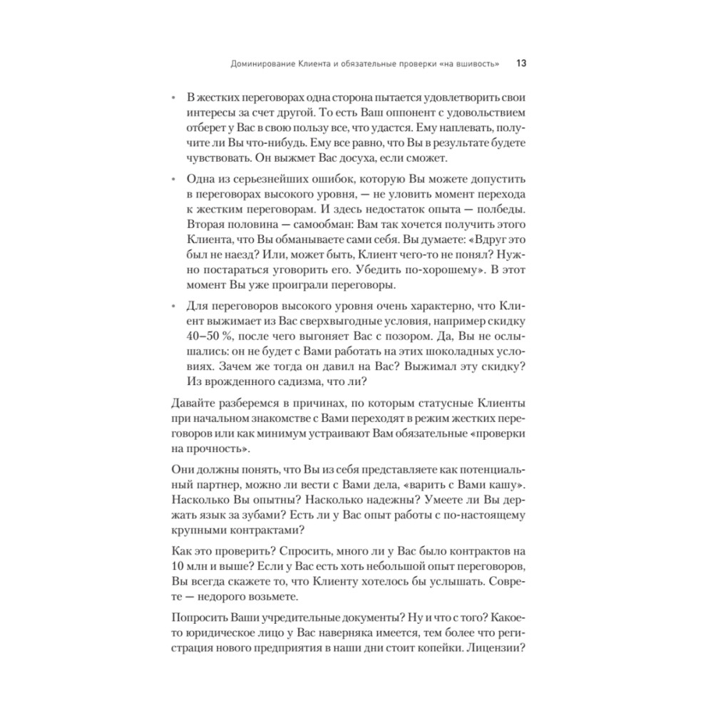 Книга адресована всем, кто участвует в переговорах и продажах любого уровня, — от директоров компаний, руководителей и собственников бизнеса (для которых она будет ПОЛЕЗНЕЙШИМ ПРАКТИЧЕСКИМ РУКОВОДСТВОМ К ДЕЙСТВИЮ) до начинающих менеджеров по продажам (пусть знают, куда им расти!).