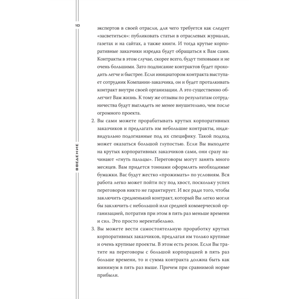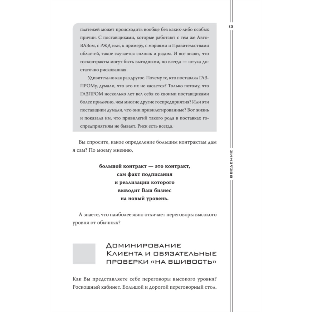 В книге автор отразил ключевую, наиболее эксклюзивную часть личного опыта, который он приобрел за двадцать два года непрерывных переговоров и продаж. Также в книгу вошел опыт многих участников тренингов «Большие контракты» — руководителей продаж, директоров и владельцев различных бизнесов России и СНГ. Опыт самых сильных переговорщиков-практиков — и больше ничего!