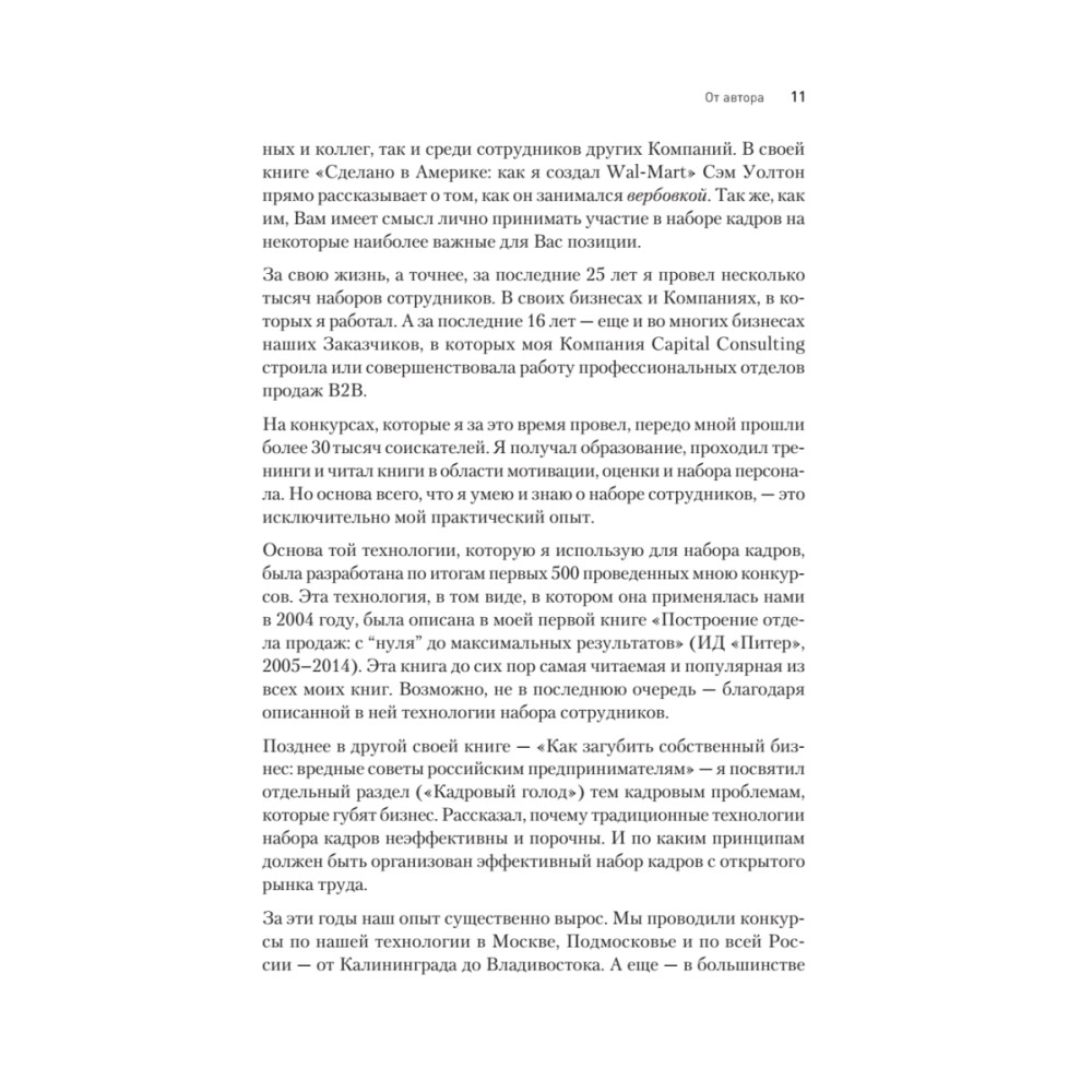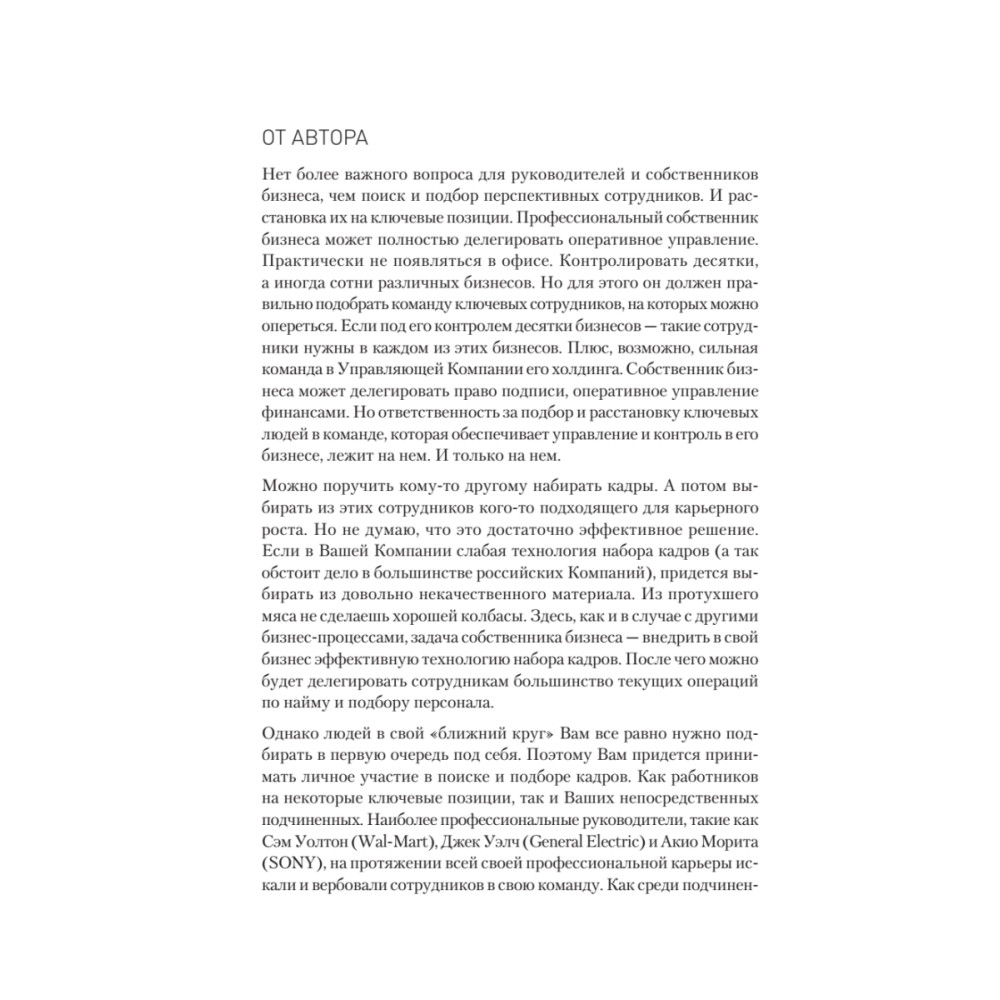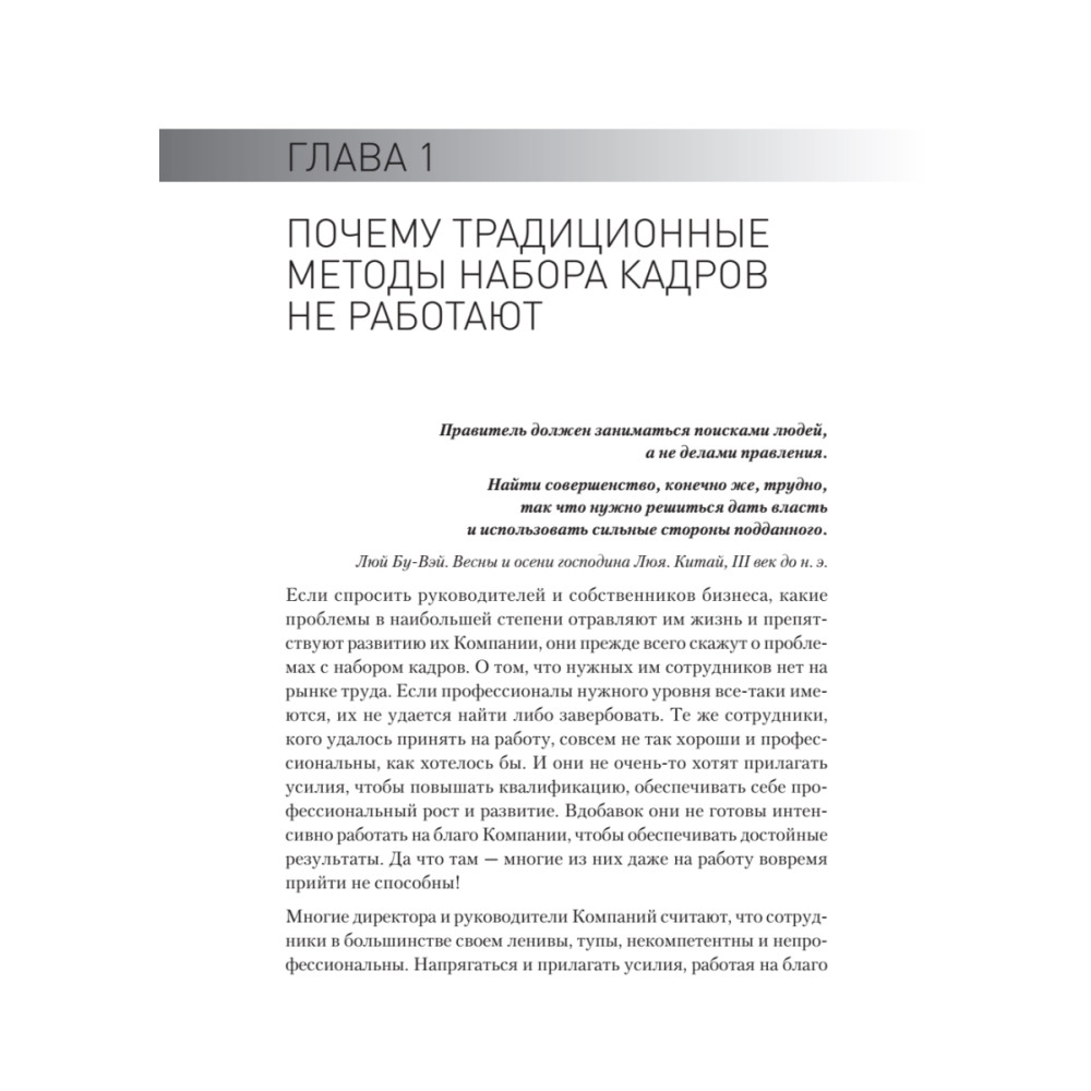 В современных условиях жесточайшей конкуренции сильные кадры — самый важный фактор успеха бизнеса. Руководитель и собственник бизнеса может делегировать право подписи, оперативное управление финансами. Но ответственность за подбор и расстановку ключевых людей в команде, которая обеспечивает управление и контроль в его бизнесе, лежит на нем. И только на нем. Наиболее профессиональные руководители, такие как Сэм Уолтон (Wal-Mart), Джек Уэлч (General Electric) и Акио Морита (SONY), на протяжении всей профессиональной карьеры искали и вербовали сотрудников в свою команду. Так же, как им, Вам имеет смысл лично принимать участие в наборе кадров на некоторые наиболее важные для Вас позиции. Книга представляет конкретные причины, почему не работают традиционные методы, и уникальную технологию набора персонала как с открытого рынка, так и с внутреннего путем проведения конкурса на основе кадрового ассессмента. Предлагается и альтернативный вариант — вербовка, необходимая, когда Вы уже присмотрели интересующего сотрудника и Ваша цель — пригласить на работу в Компанию именно его. Благодаря внедрению в Ваш бизнес предложенной системы набор кадров станет для Вас не проблемой, а конкурентным преимуществом. Вы сможете выстроить набор кадров в Вашей Компании так, чтобы вербовать в свою команду отличных сотрудников на весьма привлекательных для Вас условиях! Издание адресовано собственникам и руководителям коммерческих предприятий, а также всем, кто только создает свой первый бизнес-проект.
