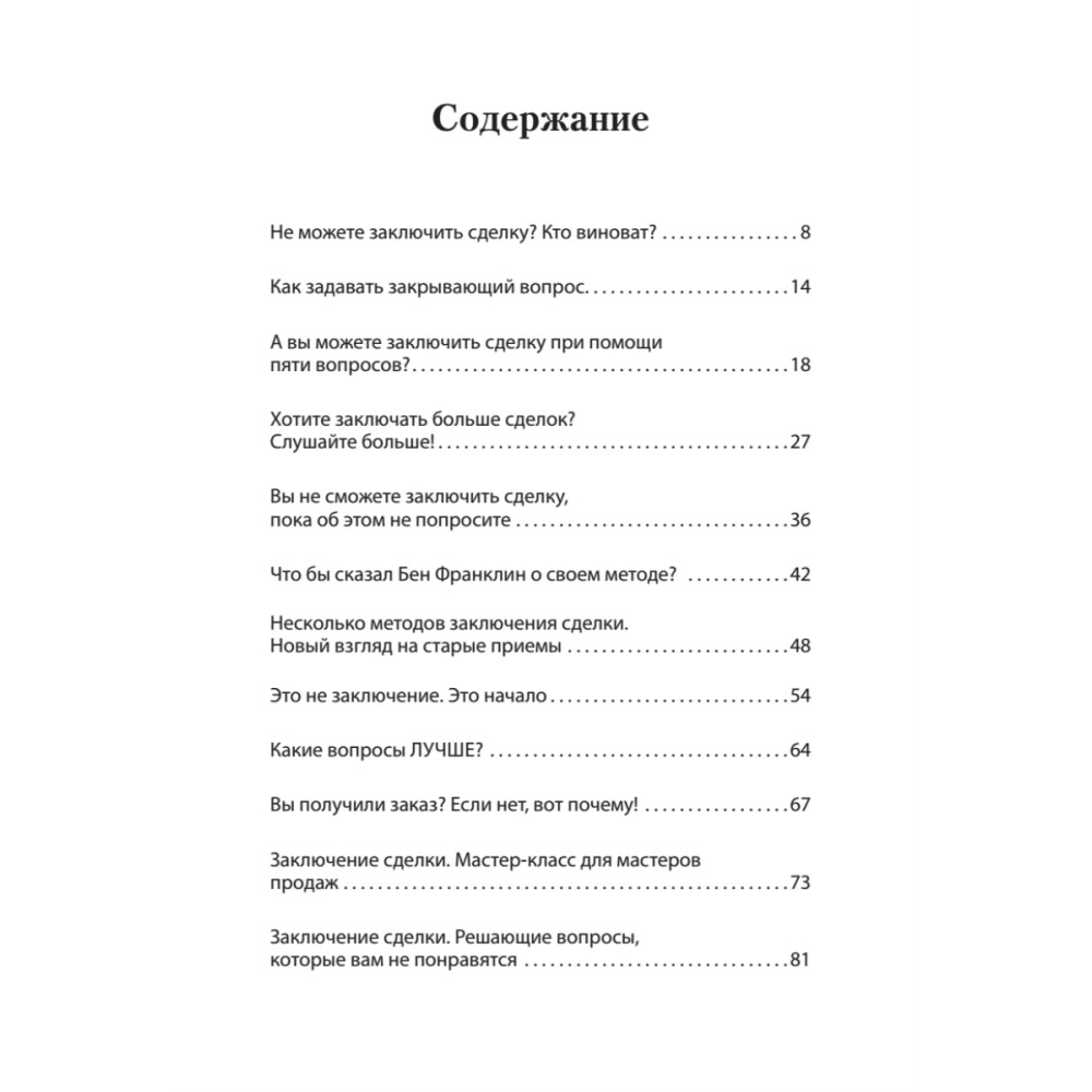 В книге рассмотрены: 1) 5 ключевых вопросов, ответив на которые, вы сможете закрыть любую сделку; 2) 6 методик продаж, которые используют все высокоэффективные менеджеры; 3) 14 советов, которые помогут повысить производительность и уменьшить количество ошибок. Их освоение гарантирует вам успешное завершение любой сделки, довольных и лояльных клиентов, а главное – больше продаж за то же время.