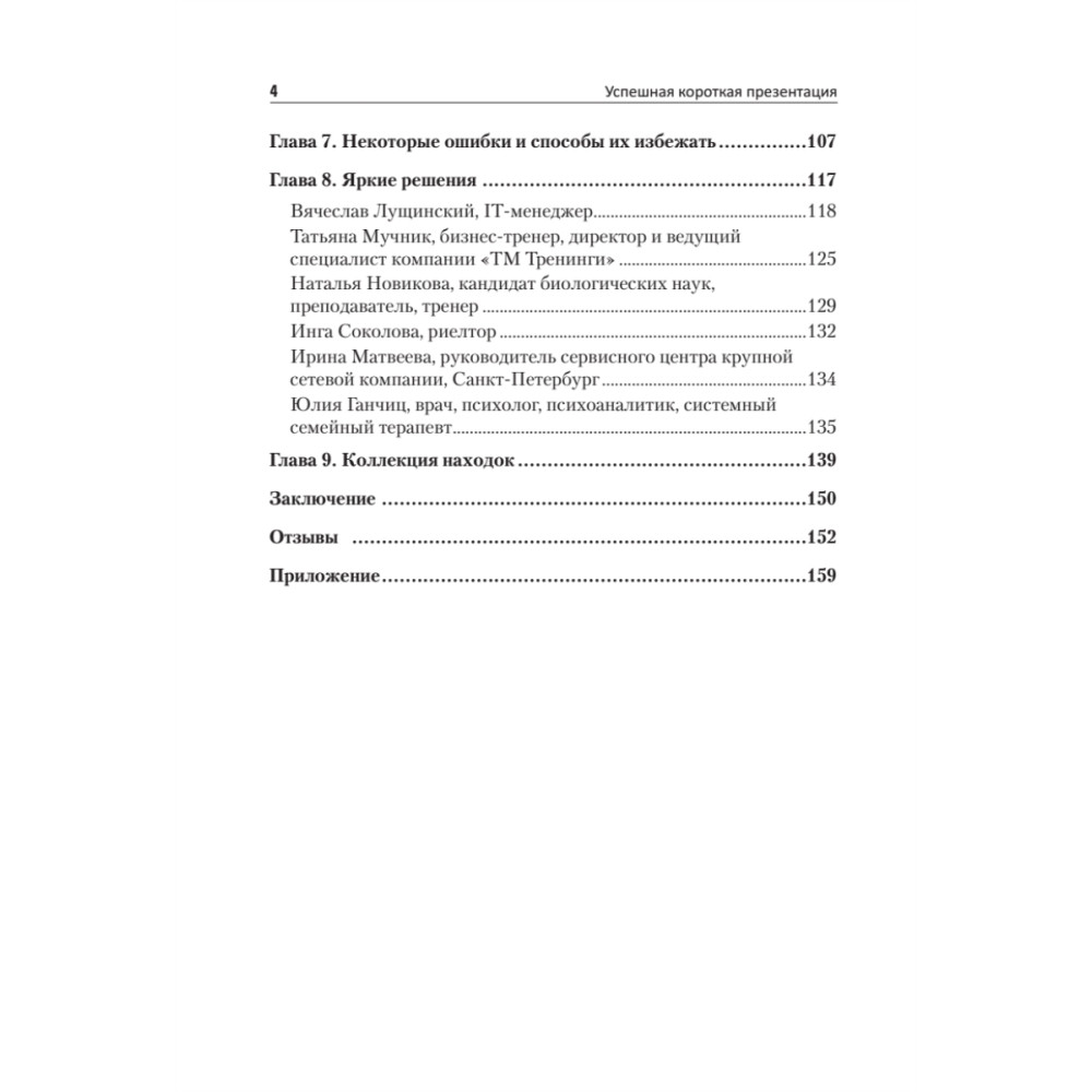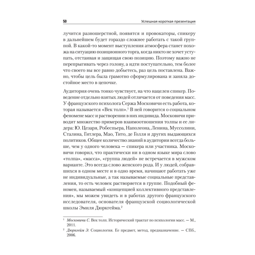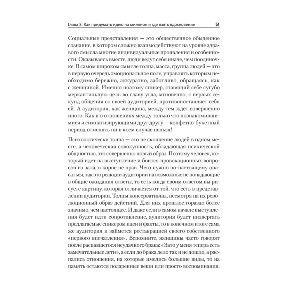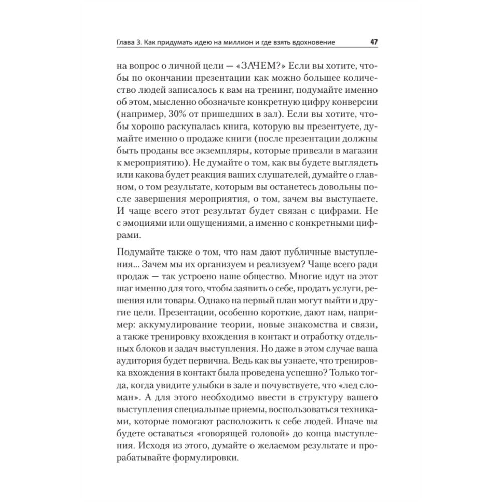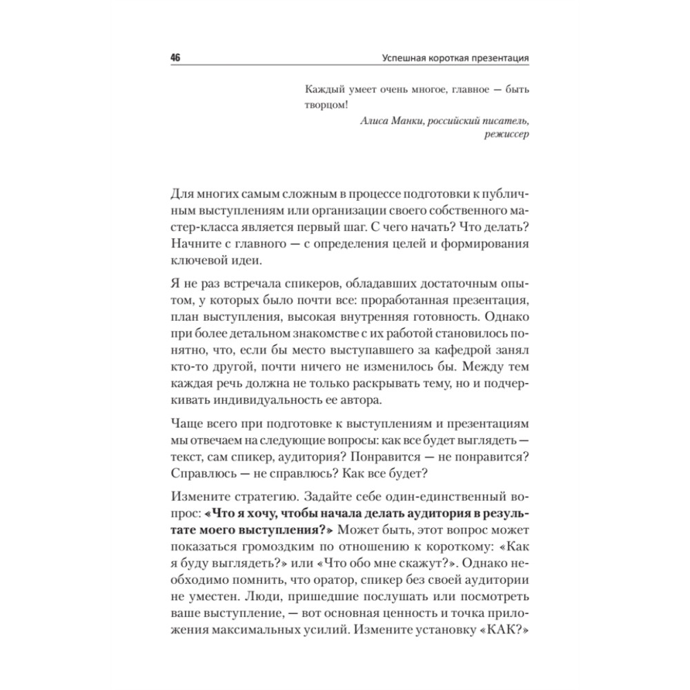 Представителям многих профессий, чтобы стать заметнее и успешнее, приходится предпринимать шаги в сторону публичности. Для многих бизнес-тренеров, психологов, консультантов уже стало нормой перед проведением тренинга или иного обучающего мероприятия проводить короткие, от 1 до 2-3 часов, продающие презентации и мастер-классы. Мы находимся в начале формирования нового тренда — эпохи коротких продающих выступлений. Начните общаться с аудиторией, говоря просто — о высоком, доступно — о сложном. Ключевое слово — общение, то есть на равных. Ораторы с гипнотическим авторитетом в мировой истории уже были, и их успех завораживает, вспомните Мартина Лютера Кинга и его речь «У меня есть мечта», Стива Джобса со словами выпускникам Стенфорда и Рэнди Пауша. В чем же секрет успеха этих спикеров? В правильной постановке цели, мощной идее, структуре и манере преподносить информацию. Они рассказывают о себе аудитории. Именно этого сейчас ждет публика, именно этого ей так не хватает. И именно за такими спикерами и их идеями она готова следовать. Эта книга посвящена тем, кому приходится делать небольшие — от 10 минут до 1,5 часов публичные выступления — это студенты и преподаватели, психологи и бизнес-тренеры, врачи и консультанты, инфобизнесмены и ведущие вебинаров, маркетологи и пиарщики, политики и руководители. Тем, кто уже читает лекции, делает так называемые «продающие» презентации, а также ведет переговоры и выступает перед аудиторией. И тем, кому это только предстоит, кто хочет быть максимально убедительным, ярким, запоминающимся и успешным.