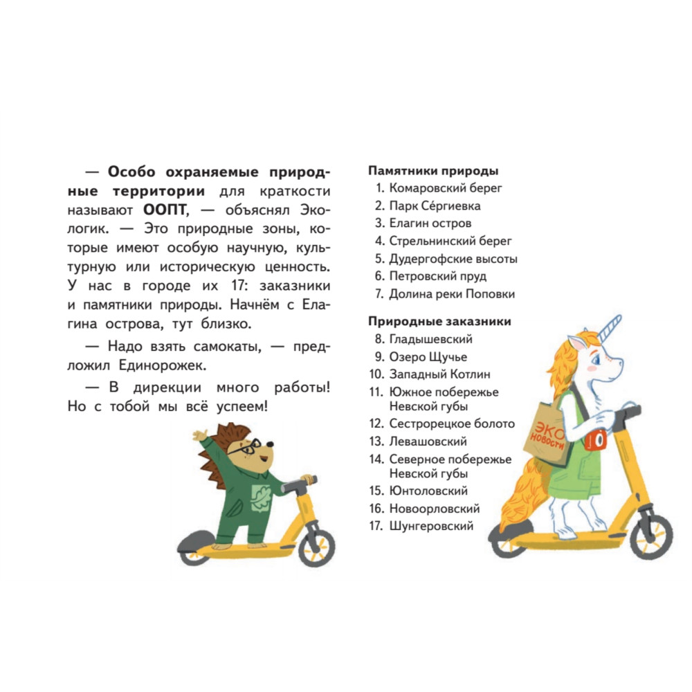 Репортёр газеты «Эко-Новости» Единорожек Эко со своим давним другом Ёжиком Экологиком отправляются в путешествие по особо охраняемым природным территориям Санкт-Петербурга. Присоединяйся к увлекательному и познавательному путешествию двух исследователей и ты узнаешь, какие звери и птицы водятся в городских парках и лесах, как они называются и как выглядят, какие уникальные растения и вековые деревья здесь растут. Рассчитаешь время для прохождения экологической тропы и освоишь основные правила экологически ответственного поведения, встретишь закат на берегу Финского залива и послушаешь голоса различных птиц. Это книжка-игра — раскраски, головоломки, ребусы, занимательные и полезные задания.