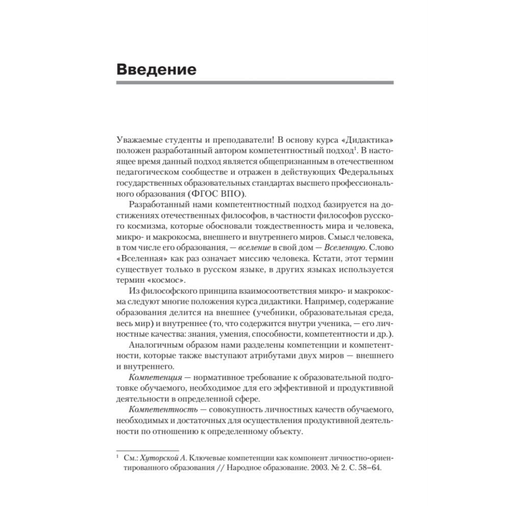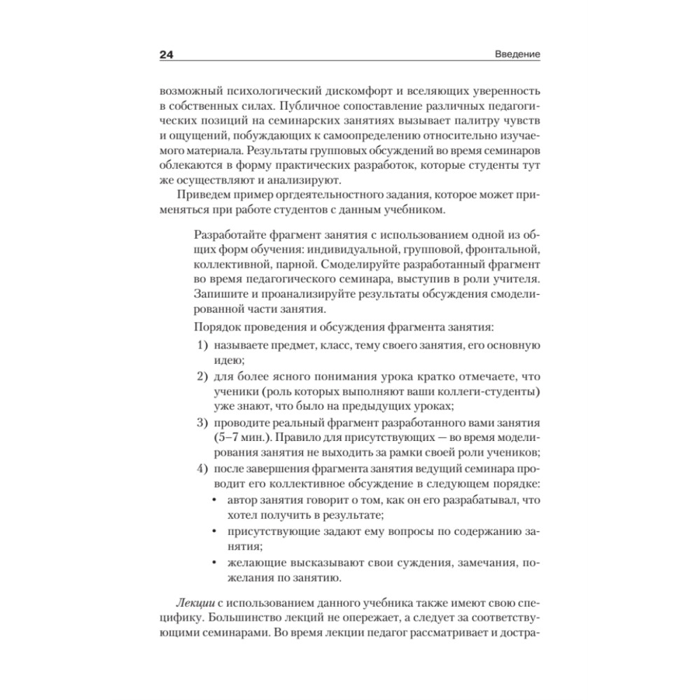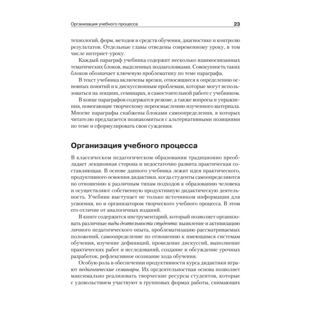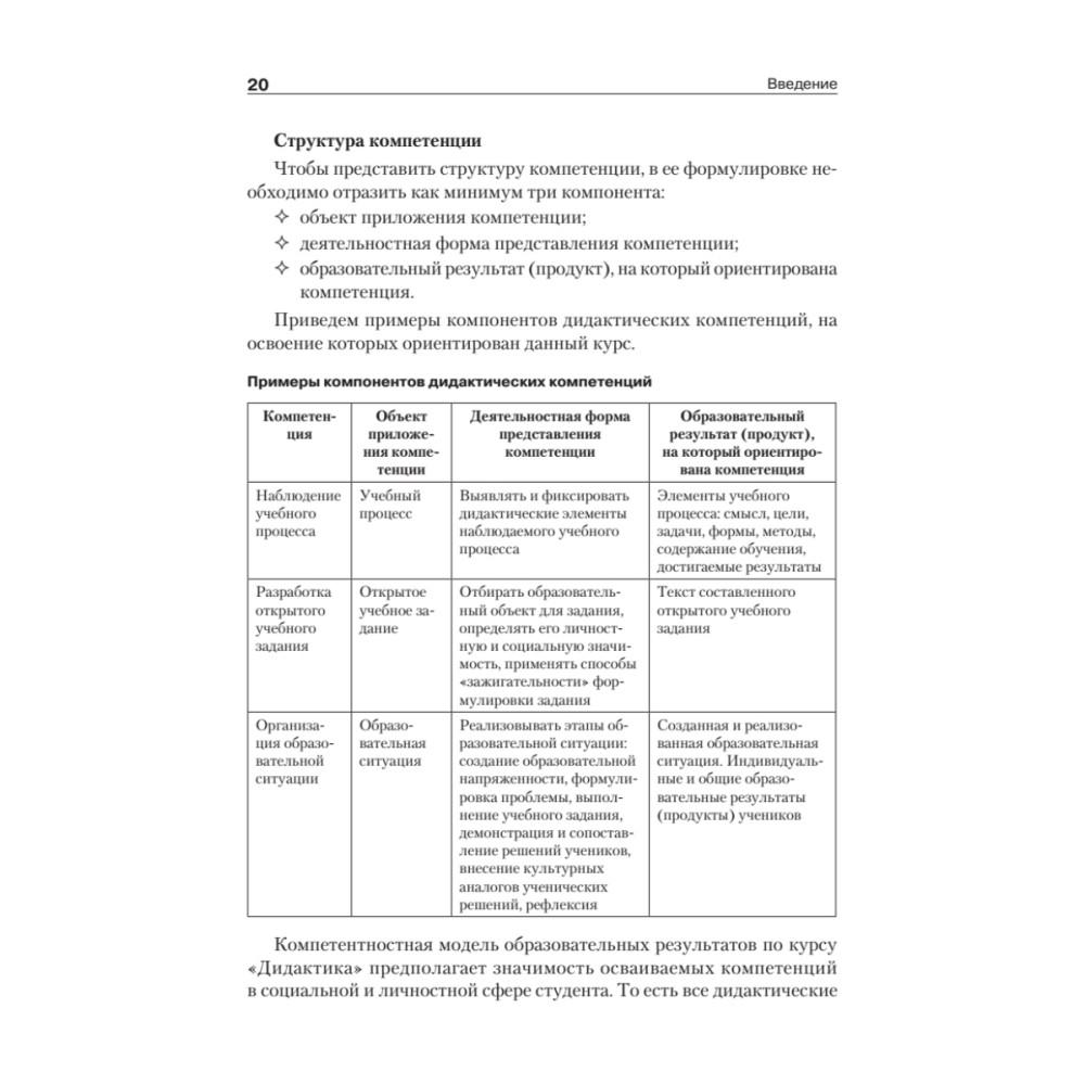 Учебник построен на компетентностной основе: каждый параграф содержит дискуссионные вопросы, упражнения, задания дидактического практикума, которые направлены на освоение профессиональных компетенций. Диагностике и оценке подлежат создаваемые студентами фрагменты уроков, учебных программ, образовательные ситуации, разработки систем занятий и др.