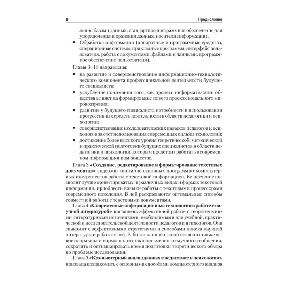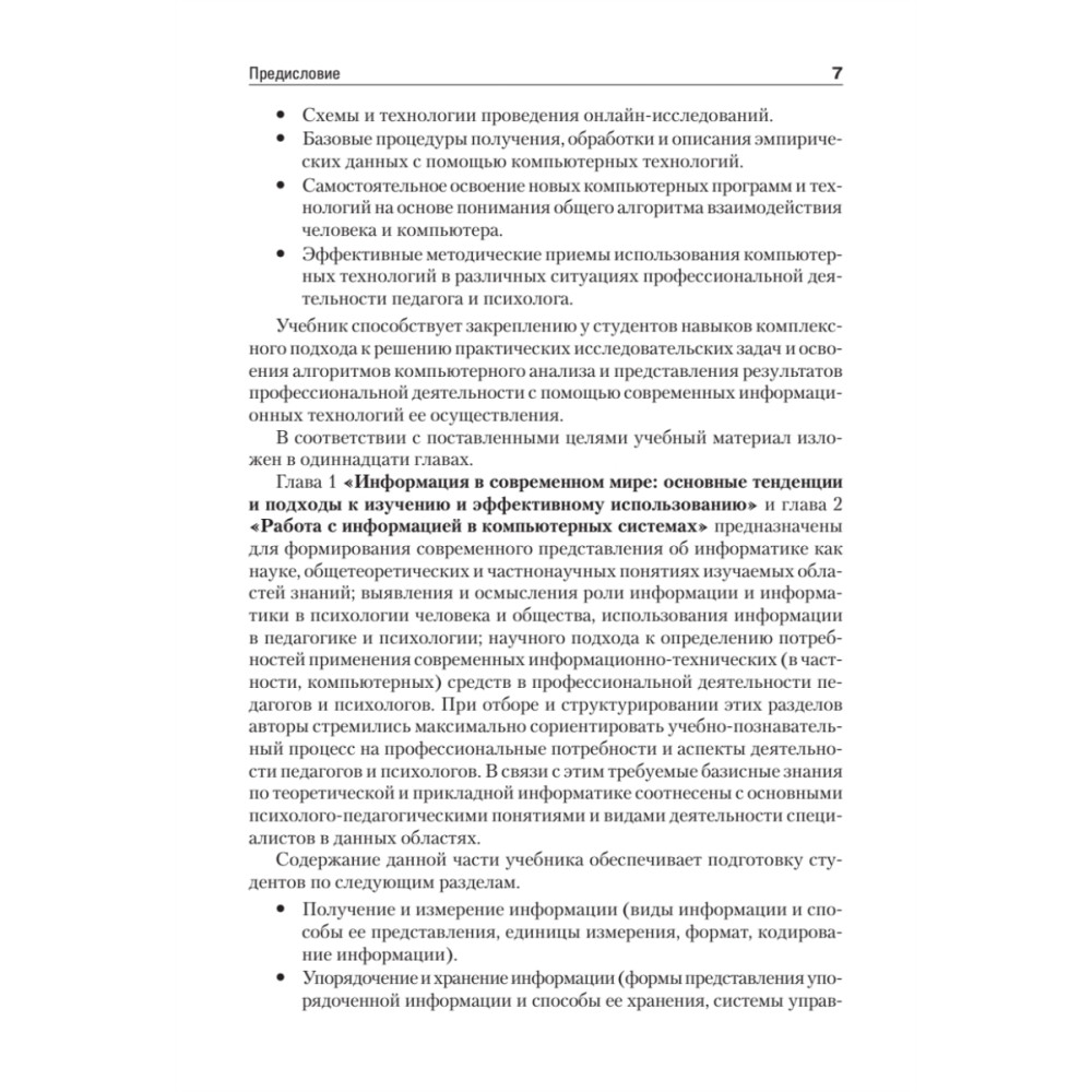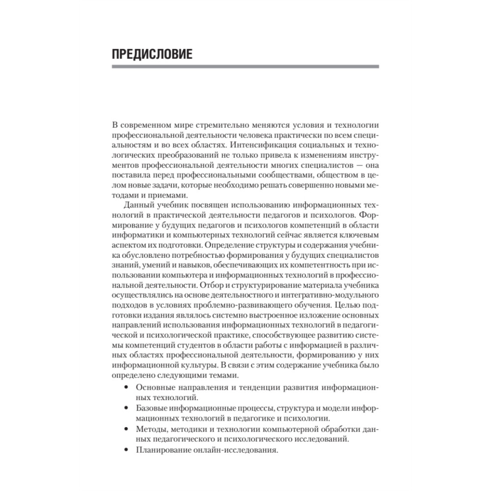 Данный учебник посвящен вопросам использования информационных технологий в деятельности педагогов и психологов. Структура и содержание учебника обусловлены потребностью формирования компетентности будущих специалистов в использовании компьютера и информационных технологий в профессиональной деятельности. Учебник направлен на закрепление у студентов навыков решения практических исследовательских задач; освоения алгоритмов компьютерного анализа и представления результатов профессиональной деятельности с помощью современных информационных технологий. Учебник предназначен для студентов педагогических вузов и написан в полном соответствии с требованиями Государственного образовательного стандарта третьего поколения и имеет гриф УМО по направлению подготовки бакалавров 050100 «Педагогическое образование».