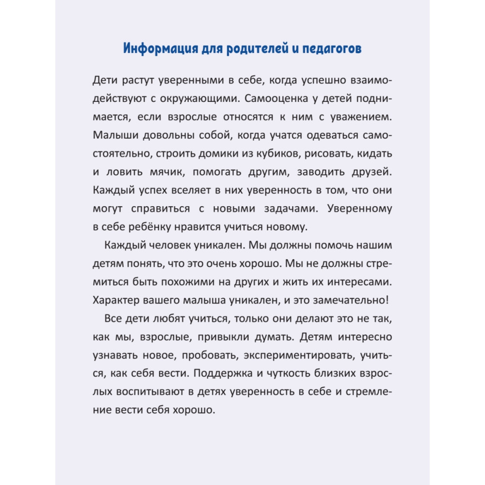 Эта книга поможет вашим детям научиться сохранять уверенность в себе даже в сложных для них ситуациях. Морская свинка и ее друзья покажут, как справляться с трудностями, не теряя присутстсвия духа и уверенности в себе. Ваш малыш получит большое удовольствие, слушая книгу и рассматривая картинки. Для чтения взрослыми детям.