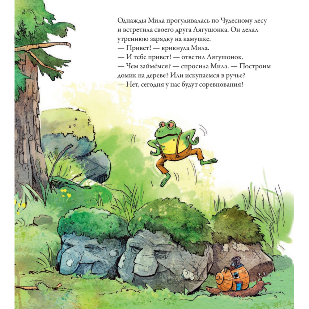 У Милы потрясающий дедушка, он умеет рассказывать истории о Чудесном Лесе, где может случаиться все, что угодно. В них Мила встречается с любыми зверями, с какими пожелает, и может даже поговорить и поиграть с ними! Каждый раз, когда дедушка начинает свою сказку, Милу ждут новые приключения. Хочешь послушать одну из них? В этой сказке Мила отправится в Чудесный лес и познакомится с хитрым и веселым Лягушонком.