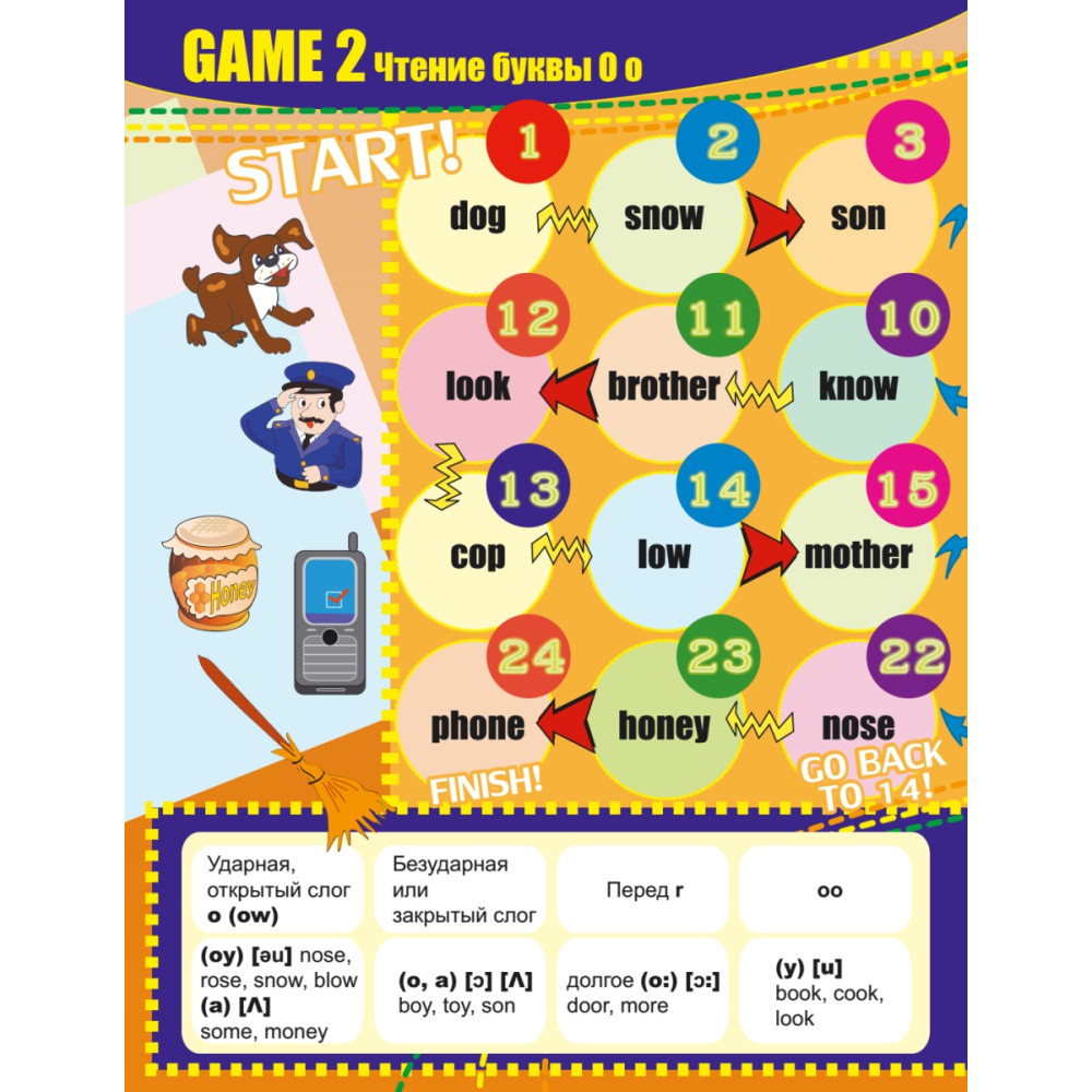 Возьмите кубик, фишки и начинайте чи… играть. Прогулявшись по увлекательным игровым полям, ребенок усвоит правила чтения гласных и их сочетаний и выучит множество новых слов. А кроме того, вся семья проведет за игрой немало приятных минут. Помните: английский сближает!
