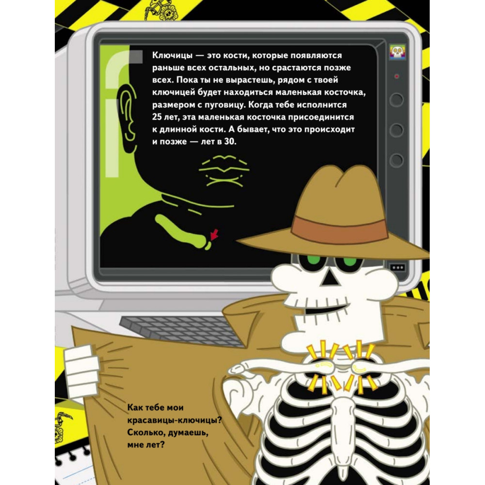 Привет! Меня зовут Скелет Холмс. Я самый опытный сыщик. Хочешь провести со мной расследование и узнать всё о костях? Тогда за мной! Я расскажу, почему у взрослых костей меньше, чем у малышей, кто такие ключицы и почему кости крепче железа. Скорее! Нужно разгадать все загадки скелета!