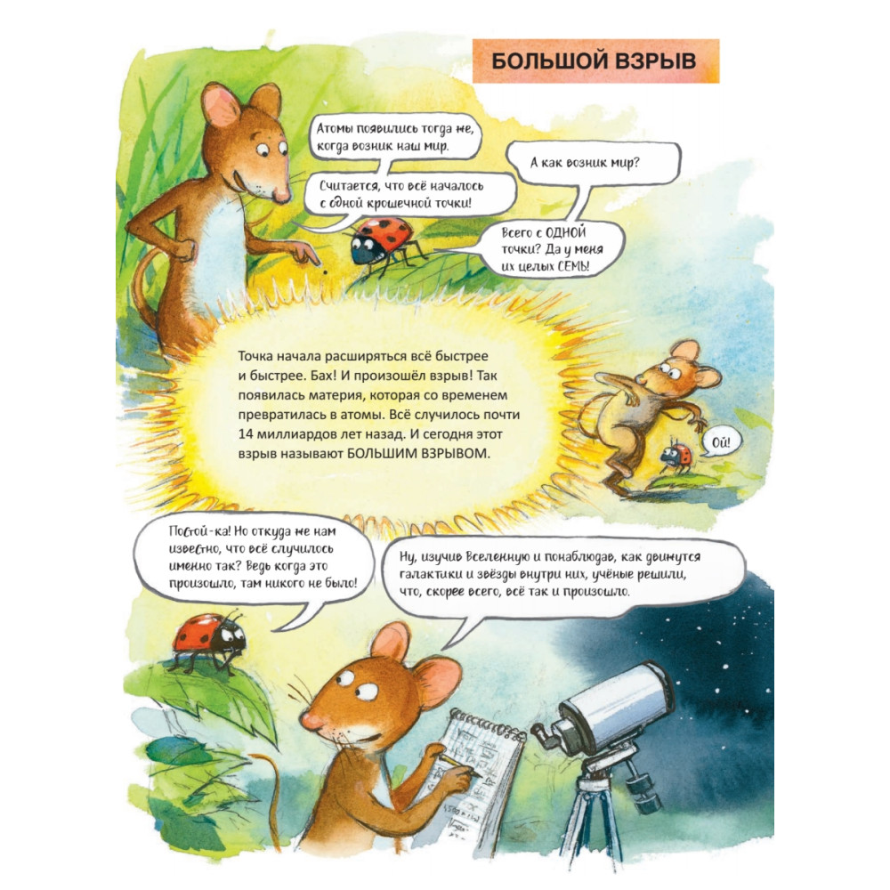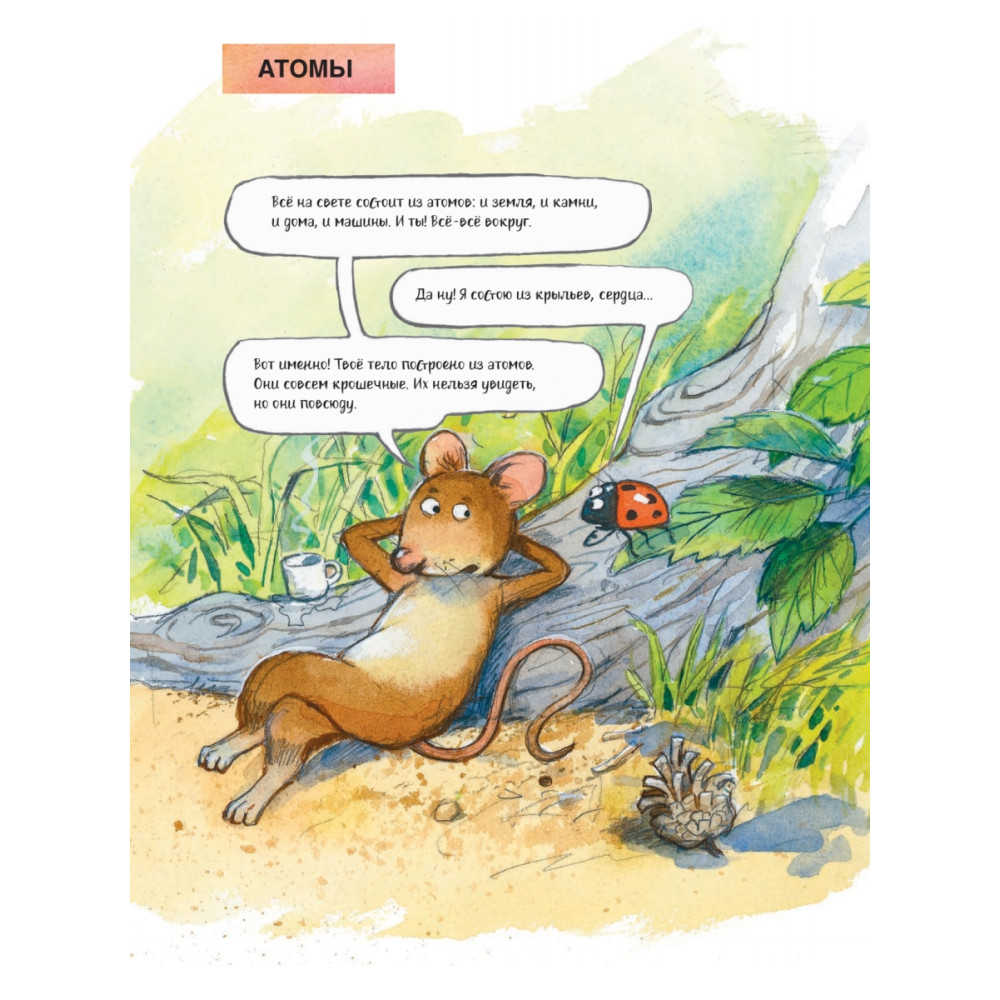Все вокруг состоит из атомов, а из чего состоят сами атомы, и откуда они взялись? Любопытная Божья Коровка решила расспросить об этом своего друга, очень умного Мышонка. А вам, ребята, тоже интересно получить ответы на эти вопросы? Тогда давайте послушаем умного Мышонка вместе! Он расскажет нам, - как появилась планета Земля, на которой мы живем; - как на Земле зародилась жизнь; - как атомы соединяются, чтобы образовать самые разные тела и вещества; - почему вода мокрая, а камни твердые. Книга для детей дошкольного и младшего школьного возраста.
