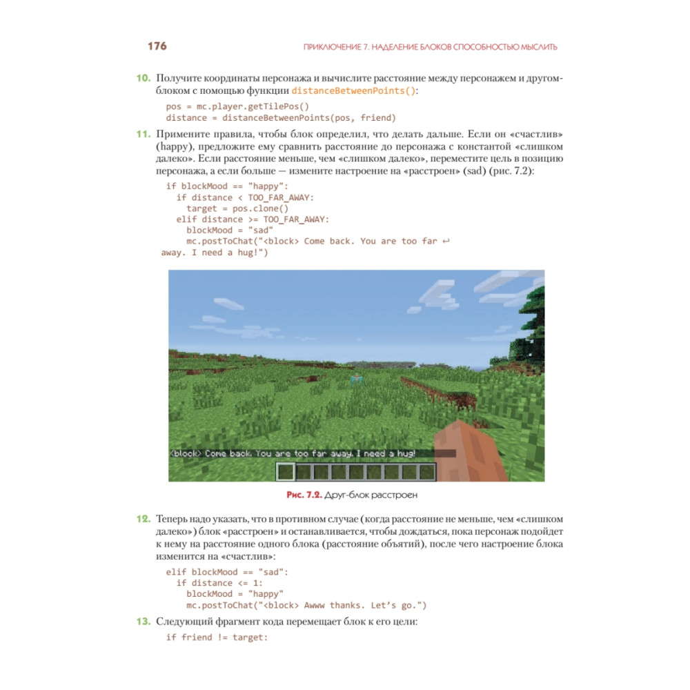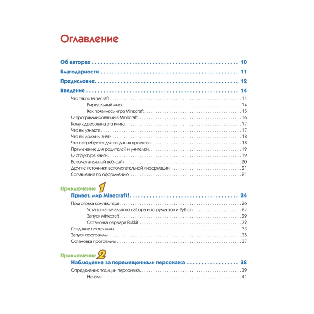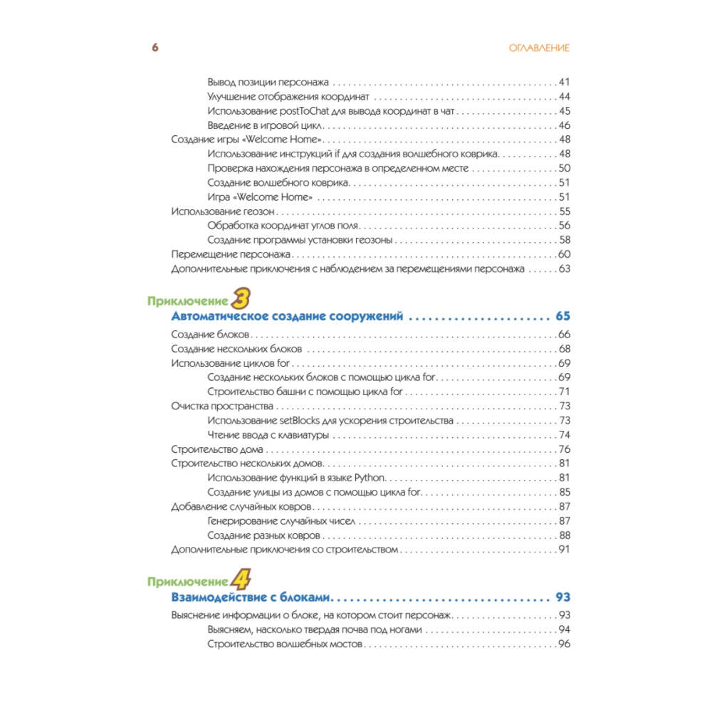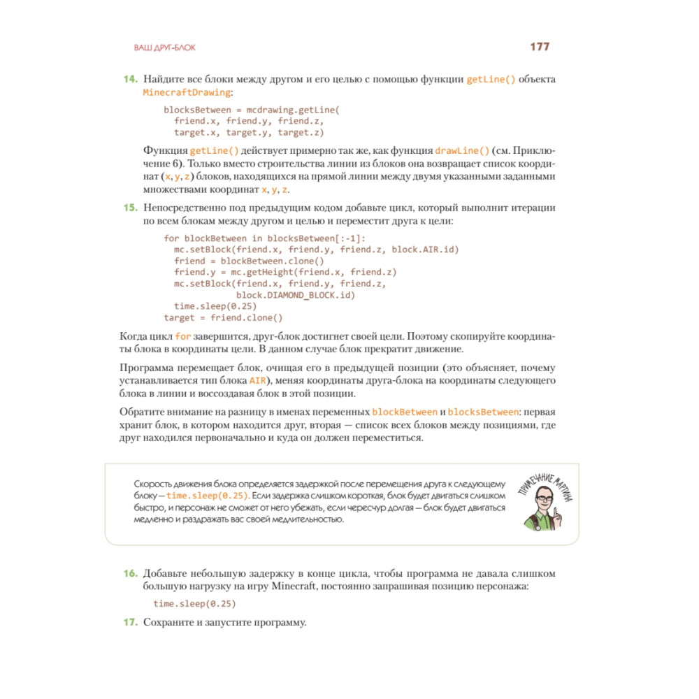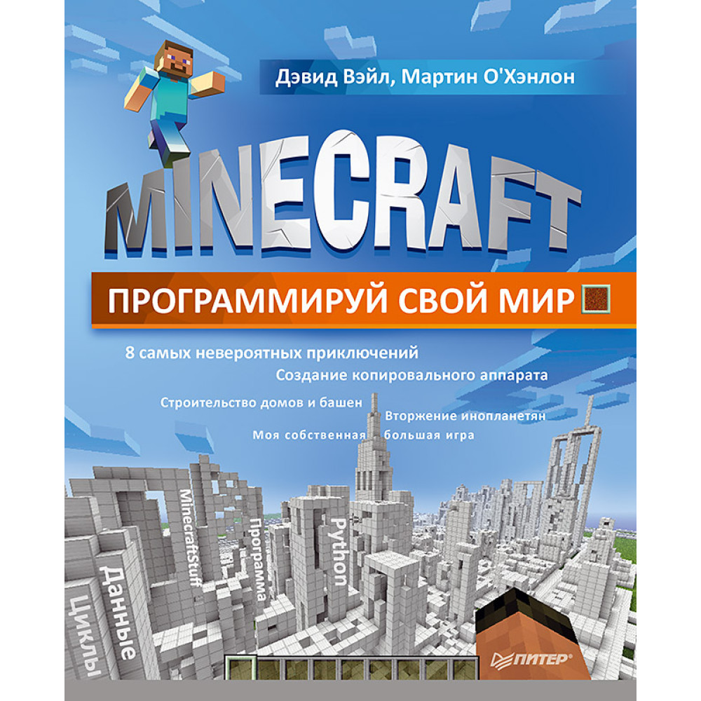 В ваших руках не просто книга, а счастливый билет в удивительный мир Minecraft и программирования. Возможности творчества в компьютерном мире безграничны. Эта книга специально написана для тех, кто не только любит играть, но и хочет создавать что-то новое. Вы с легкостью освоите программирование, просто играя в Minecraft. В этом вам помогут простые пошаговые инструкции, позволяющие не только написать программу на Python, но и построить дом, фантастическое сооружение или даже 3D-копировальную машину. Вы сможете создавать собственные интерактивные игры, заниматься поиском сокровищ и даже возводить невероятные гигантские 2D- и 3D-объекты (сферы и пирамиды). Все в ваших силах — постройте работающие огромные Minecraft-часы, спланируйте нападение инопланетян и даже сражение. Навыки программирования, полученные в этой книге, позволят вам раскрыть невероятные возможности Minecraft, недоступные вашим друзьям и знакомым.