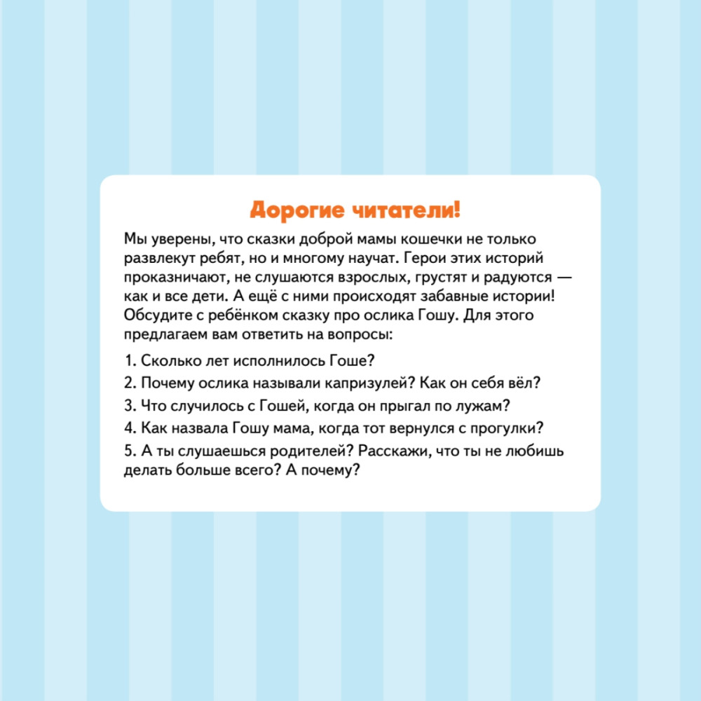Маленький ослик Гоша – ужасный капризуля. Вместо «спасибо» он говорит: "Не хочу!" Перед прогулкой ворчит: "Не буду!" Ничего не хочет упрямый малыш – ни чистить зубы, ни расчёсываться. Но однажды он не послушал совета друзей и превратился… Хочешь узнать в кого? Усаживайся поудобнее! Пришло время доброй сказки от мамули кошечки. Книги серии "Капризный малыш. Сказки мамы кошки" помогают маленьким читателям легко справиться с непослушанием, упрямством, плохим сном и аппетитом... Мудрая мама кошечка знает все секреты хорошего поведения! Иллюстратор серии – Рина Зенюк – автор знаменитых "Синих Котов", которых любят малыши и их родители по всему миру. Автор предисловия в стихах – Татьяна Коваль. Для чтения взрослыми детям.