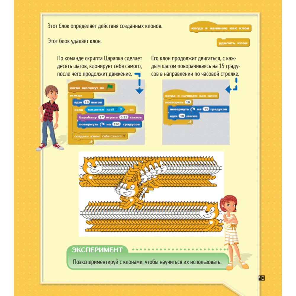 А теперь — самое главное. Ты можешь сам делать такие программы! Придумывать игры со своими героями, рисовать мультфильмы — все, что захочешь. Для этого создали специальную детскую среду программирования Скретч. Все команды в ней нарисованы как цветные значки-блоки, из которых удобно собирать программы. Это похоже на конструктор «Лего». Просто берешь кубики и собираешь сложную программу или игру.