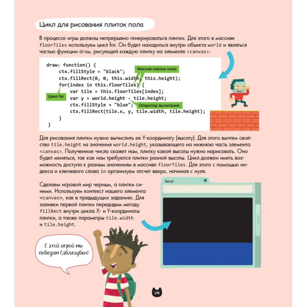 Думаешь, программировать — это сложно? Вовсе нет! Научись программировать, создавая игры на HTML и JavaScript. "Приключения Марио" и "Майнкрафт" познакомят с циклами, таймерами, подсчетом очков, работой с графикой и даже с искусственным интеллектом. Краткие и простые объяснения позволят легко создать свою игру. В начале каждой главы тебя ждет описание задачи от клуба «Счастливый кот». Тебе все расскажут об игре, которую хотят создать члены клуба. Код каждой игры разбит на небольшие фрагменты. Следуя пошаговым инструкциям, ты сам напишешь игру от начала и до конца. К концу каждой миссии у тебя будет созданная своими руками игра и приобретенные навыки. Поиграй, отдохни, а потом зайди на сайт издательства Питер за новыми книгами по программированию.