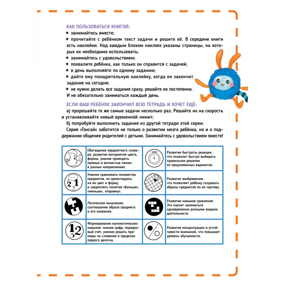 ТЭНСАЙ – это японская методика развития ребёнка XXI века! Программа основана на системе выдающегося японского нейропсихолога Рюты Кавашимы и является продолжением серии «Тренируй свой мозг», проданного в мире тиражом более 2 млн экземпляров. Специально для России профессор Лаборатории Рюты Кавашимы Руи Ноити разработал уникальную методику развития интеллекта у детей. Результаты последних исследований доказали, что регулярные занятия с детьми от 2 до 10-12 лет, в период активного развития мозга, способны привести к поразительным результатам. ТЭНСАЙ переводится с японского как «одарённый, умный, гений» и развивает как базовые способности ребенка – мышление, логику, память, воображение, внимание и наблюдательность, – так и навыки, важные в определённом возрастном периоде. Простые задания шаг за шагом простимулируют работу правого и левого полушарий мозга, повысят интеллект и умственные способности. Занимайтесь по 5 минут в день в течение двух недель и делайте первые шаги к суперинтеллекту! Для детей старшего дошкольного возраста. Рекомендована как для самостоятельных занятий родителей с детьми, так и для занятий в детских садах, центрах развития. Как заниматься по тетради? Исследования Лаборатории установили связь развития интеллекта с общением с родителями. Занимайтесь с ребенком вместе. Похвалите ребенка после завершения каждого задания. Дайте поощрительную наклейку. В день выполняйте по одной странице. Заниматься каждый день необязательно. Что делать, если тетрадь закончена, но хочется ещё? Решать тетради можно несколько раз подряд. Попробуйте во второй и последующий разы решать на скорость, и в каждый раз устанавливать новый временной лимит. Сравните результаты. Советы родителям Возраст, указанный на тетрадях, условный и служит только для ориентира. Тетради подстроены под шаги развития мозга ребенка. Поэтому если задачи в книге показались сложными, помогите ему.