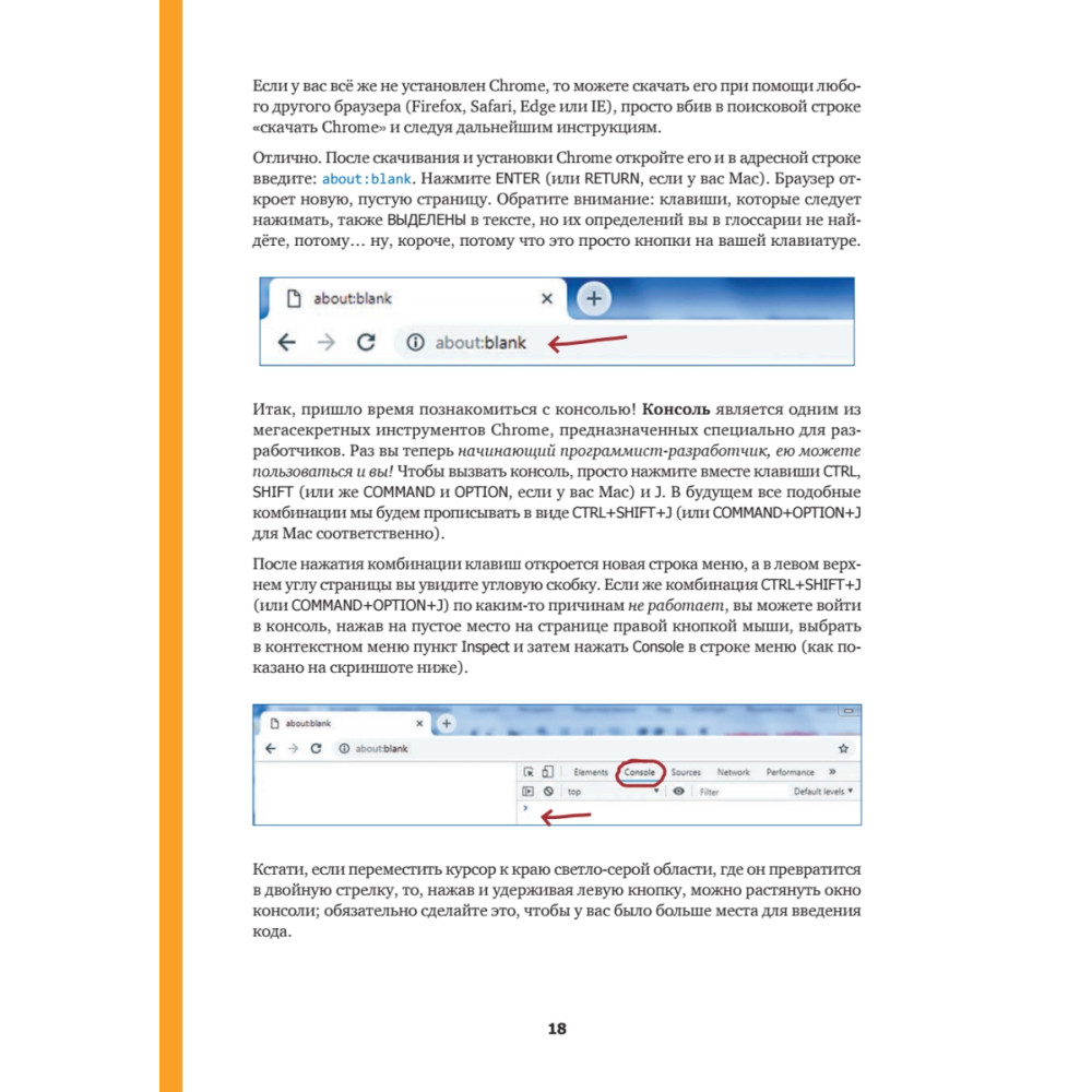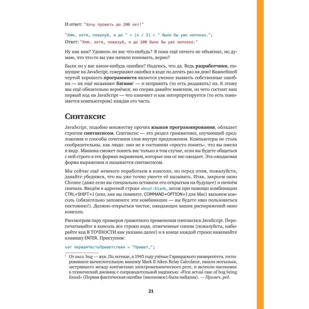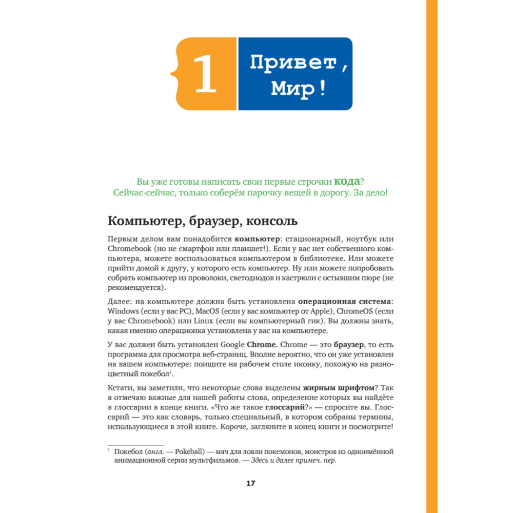 Ты любишь играть онлайн? Общаться с друзьями через ВКонтакте, Фейсбук и Инстаграм? Смотреть видеоролики на смартфоне? Все, чем ты пользуешься, было придумано обычными людьми, которые когда-то решили, что хотят заняться программированием. Умение писать код – это современная суперспособность, отличающая магов от маглов. И логичнее всего начать с изучения языка JavaScript, на котором написано более 90% всех веб-сайтов. «Учимся кодить на JavaScript» поможет тебе самостоятельно, без помощи родителей и учителей, написать программный код; ведь если говорить начистоту, большинство взрослых слабо представляют себе, как это делается. В книге много задачек и упражнений (с ответами, только чур сразу не подглядывать!). Ответов может быть несколько, главное, чтобы у тебя получился рабочий вариант. Стань круче Илона Маска! Пришло время закатать рукава и приступить к прокачке новой суперспособности!