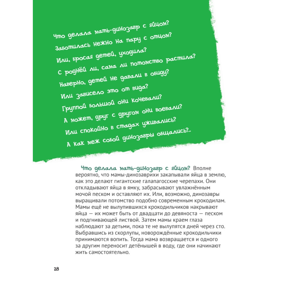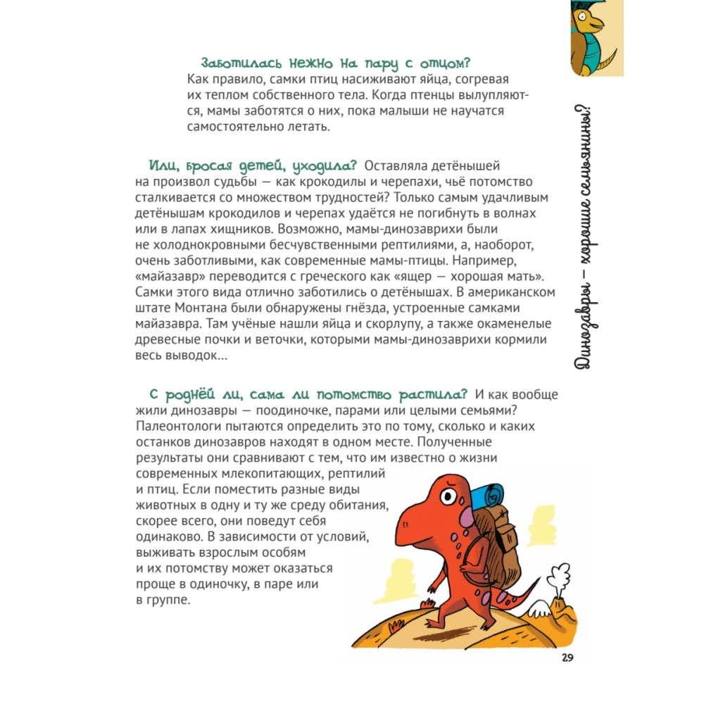 Неужели все динозавры — грозные великаны? Когда появился самый первый динозавр? Из этой книги ты узнаешь, кто такие палеонтологи и что они изучают, почему птицы выжили после падения метеорита, а динозавры — нет, и какая температура тела была у гигантских ящеров. Хочешь понять, как отличить маму-динозавра от папы-динозавра? Добро пожаловать в таинственный древний мир!