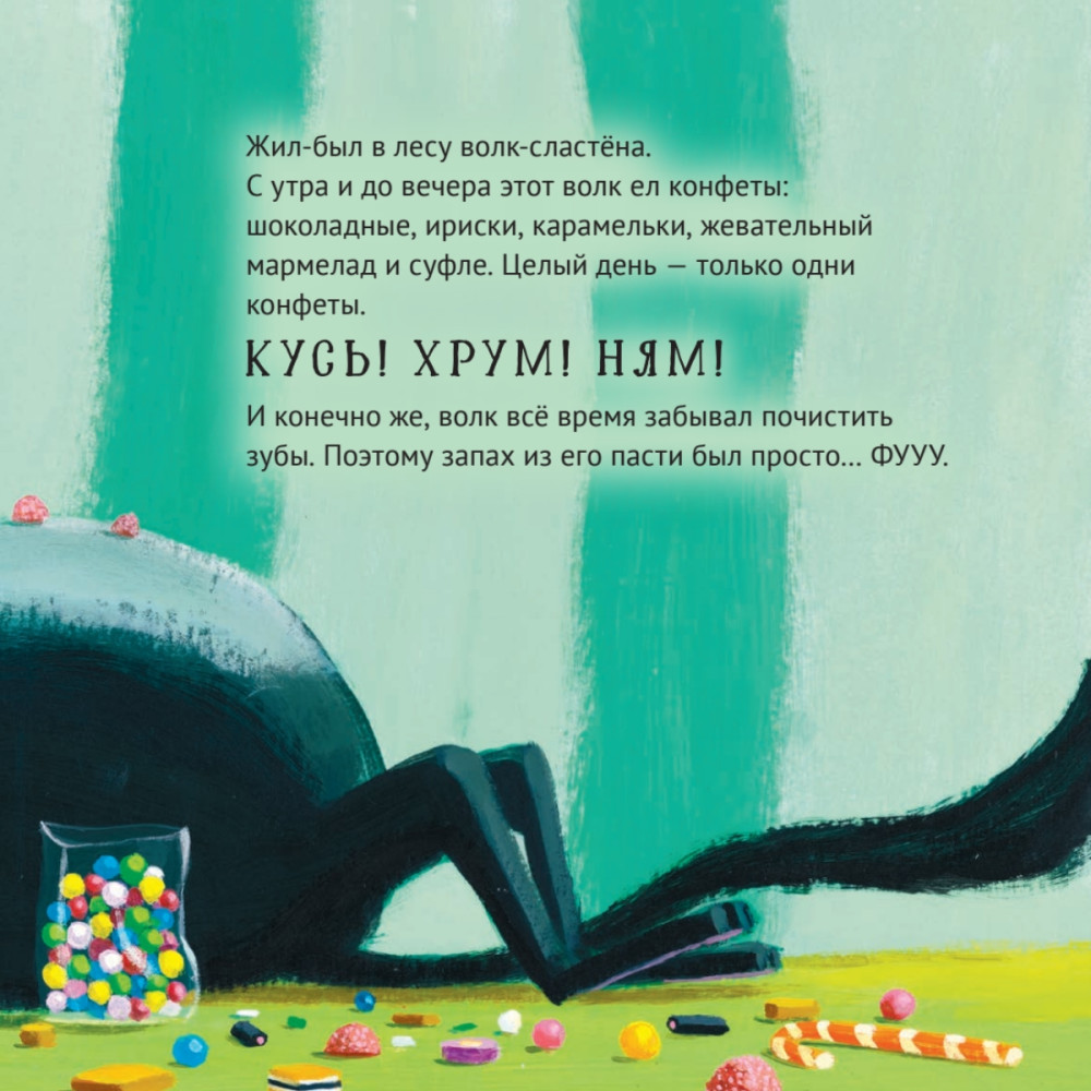 Знаете ли вы историю про волка-сладкоежку, которые ел слишком много конфет? Целыми днями он хрустел и хрустел леденцами и шоколадками, но забывал чистить зубы утром и вечером. Что же случилось с волком-сластёной? Усаживайтесь поуютнее — пришло время истории от бабушки-наседки.