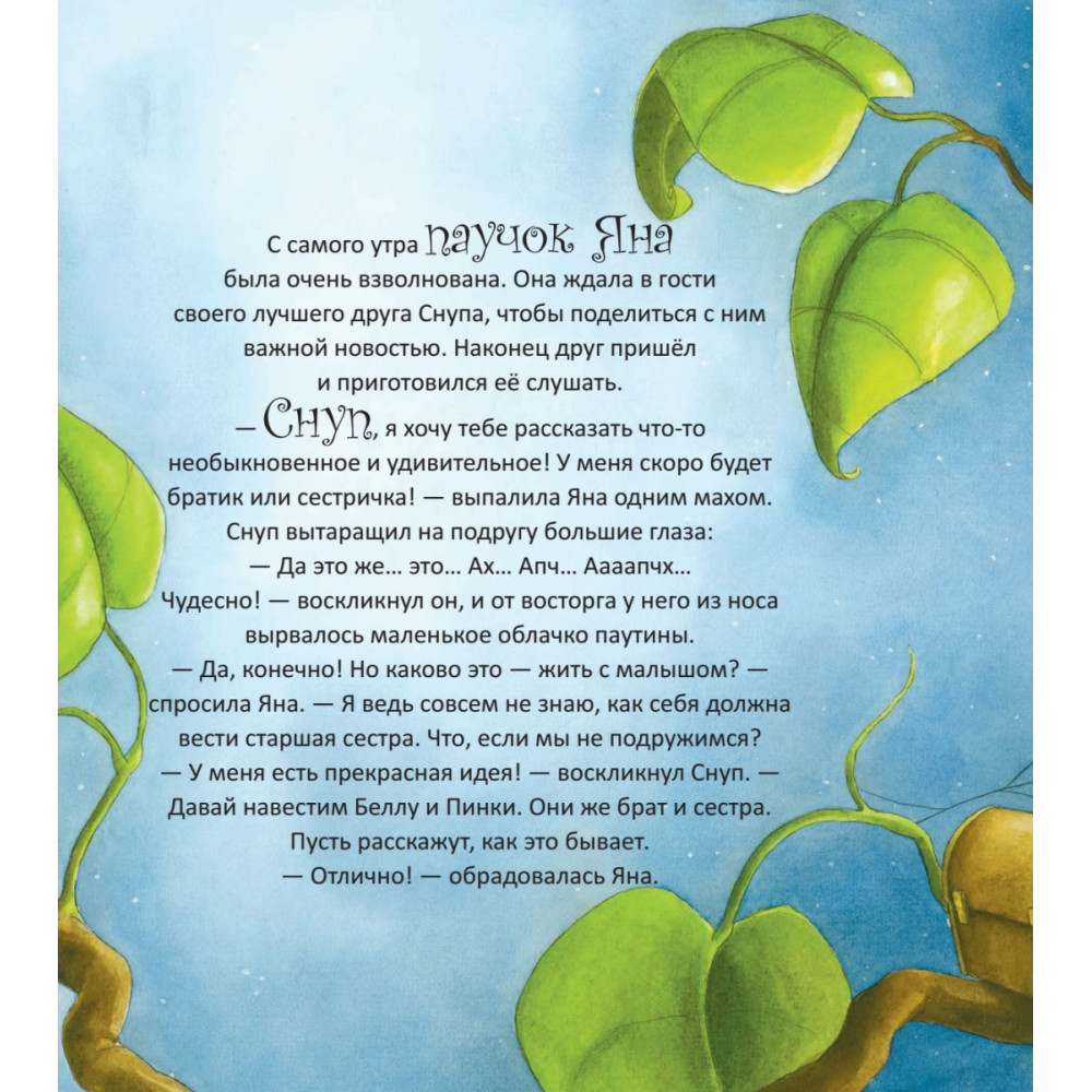 Знаешь ли ты, каково это, когда у тебя появляется в семье младший брат или сестра? Яна, маленький симпатичный паучок, который живет вместе с мамой и папой на веточке высокого дерева в лесу, тоже не знала ответа на этот вопрос. Вместе с друзьями она отправляется в путешествие по лесу, чтобы выяснить: кто такие малыши, чем они занимаются и как с ними правильно обращаться. Ведь совсем скоро и в ее семье появится Крошка...