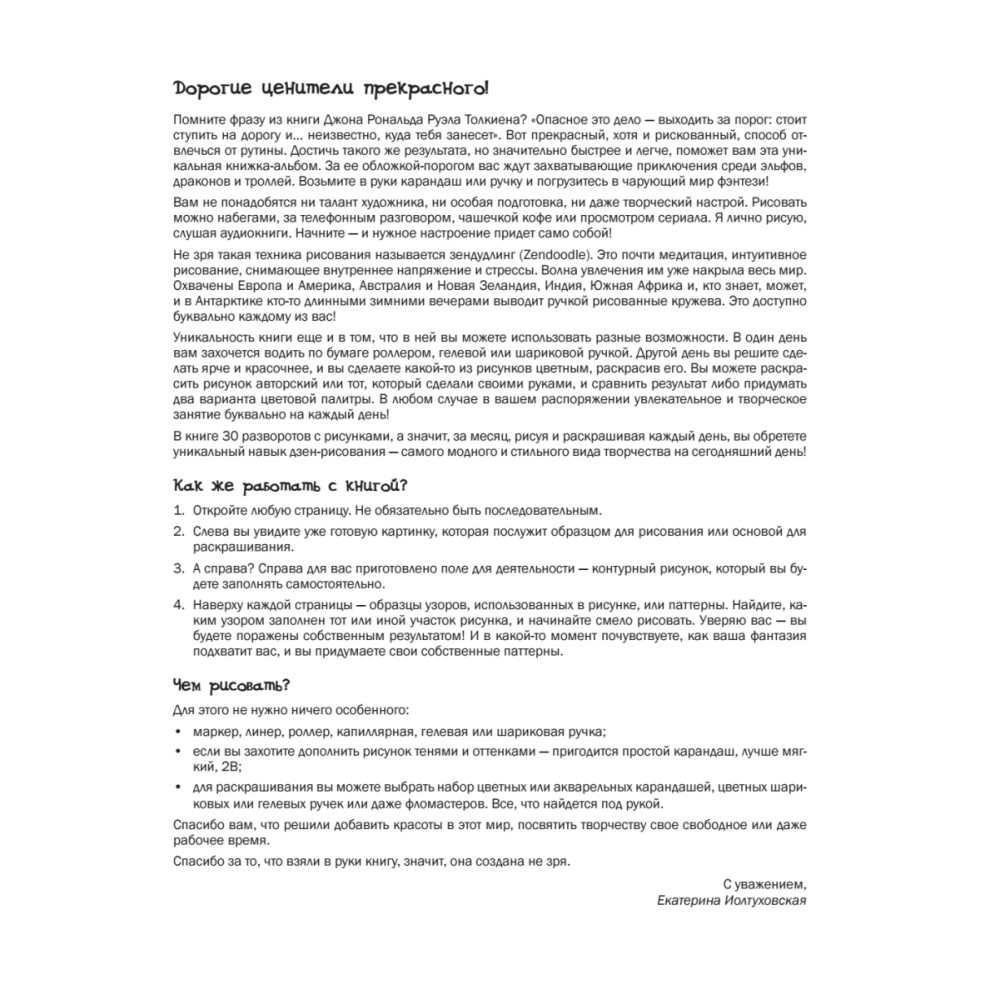 Зендудлинг как вид медитационного досуга, рисования для релакса, становится одним из самых модных видов творчества, доступным практически каждому. Сейчас интуитивное рисование, пожалуй, стало чуть ли не самым изысканным способом времяпрепровождения в среде людей творческих, креативных, состоявшихся и успешных в профессии. Современный ритм жизни требует пауз, остановок, доступных занятий для восстановления душевного равновесия. Зендудл рисуют и раскрашивают все – от студентов до бизнес-гуру. Система «Один день - один зендудл» уже стала популярной во всем мире и все больше набирает обороты. Это уникальная в своем роде книга, она сочетает в себе все преимущества толстых сборников паттернов и тонких альбомов для их раскрашивания. Для работы с такой книжкой не нужны навыки рисования, она предлагает простой и удобный алгоритм: на каждом развороте (один разворот в день, всего их 30) готовый рисунок, используемые в нем паттерны и контур рисунка, который нужно этими паттернами заполнить. Затем рисунок можно раскрасить, а при желании придумать два цветовых варианта, раскрасив оба рисунка на развороте книги. Таким образом, читатель минует стадию «это сложно, я это не смогу» и легко учится самостоятельно рисовать довольно затейливые по композиции сюжеты. Самое интригующее, самое запутанное искусство окажется не таким уж пугающе сложным, как это представляется при взгляде на готовые произведения. Отвлечься от рутины, снять стресс, расслабиться с помощью этой книжки можно даже на совещании, имея под рукой всего лишь карандаш или гелевую ручку. А система, при которой на каждый день предлагается новая картинка, удивительно затягивает в это красивое и полезное увлечение.