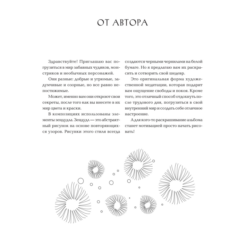 Забавные чудики, монстрики и персонажи из другого мира ждут вас на страницах этого альбома. Добавьте цвет в их мир, и ваш собственный заиграет новыми красками. Это отличный способ снять стресс и поднять себе настроение!