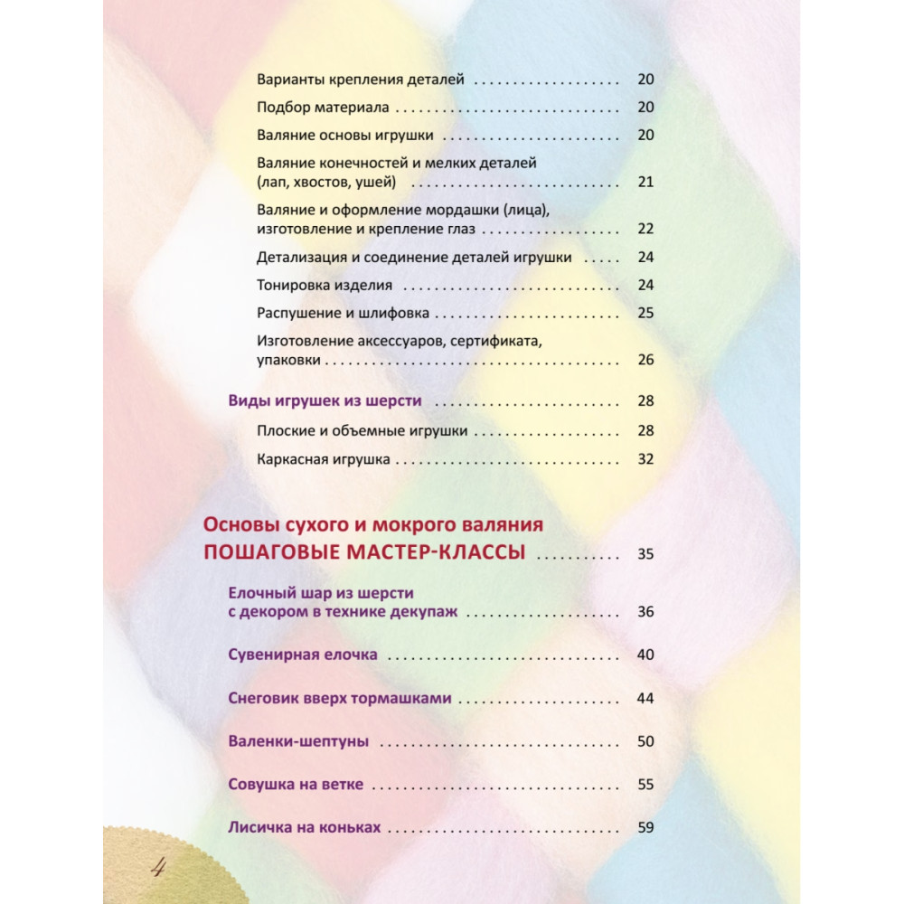 В ней автор дает основы сухого и мокрого валяния, раскрывает детали создания самых разных игрушек — от простых фигурок до сложных объемных объектов — и делится секретами этого популярного вида рукоделия. Вы узнаете, как соединять детали, делать подвижными лапки, прикреплять глазки, передавать эмоции, выполнять тонировку.