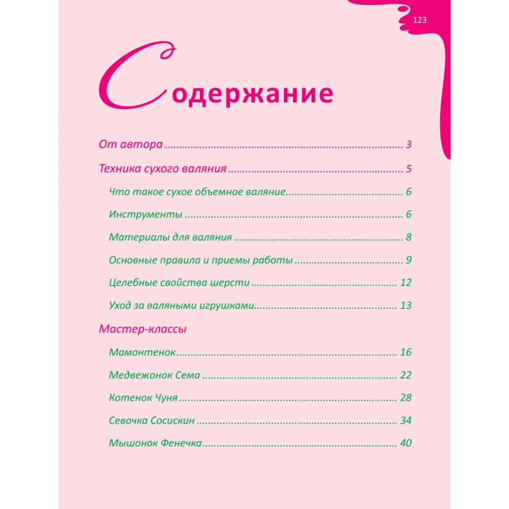Новая книга известного мастера Елены Смирновой посвящена технике сухого объемного валяния или фильца. Этот вид рукоделия завоевывает все большую популярность, ведь работа с шерстью позволяет не просто реализовать свои творческие способности и фантазии, но и приносит пользу здоровью, сохраняет тепло рук мастера. Игрушки из шерсти по-настоящему живые, и это подкупает все больше начинающих рукодельниц. В книге приведены подробные, прекрасно иллюстрированные пошаговые мастер-классы по созданию неповторимых и очень оригинальных зверюшек из шерсти по авторской методике. Автор ориентирует читателя в выборе материалов и инструментов, рассказывает об основных приемах работы с шерстью, о росписи глаз, тонировании готовой игрушки и даже о целебных свойствах шерсти. Есть в книге и мастер-классы нескольких учеников Елены Смирновой. Книга построена по принципу «от простого к сложному», поэтому пригодится как уже опытным, так и начинающим рукодельницам. Даже не имея навыков валяния, вы сможете сотворить своими руками теплое и красивое шерстяное чудо.