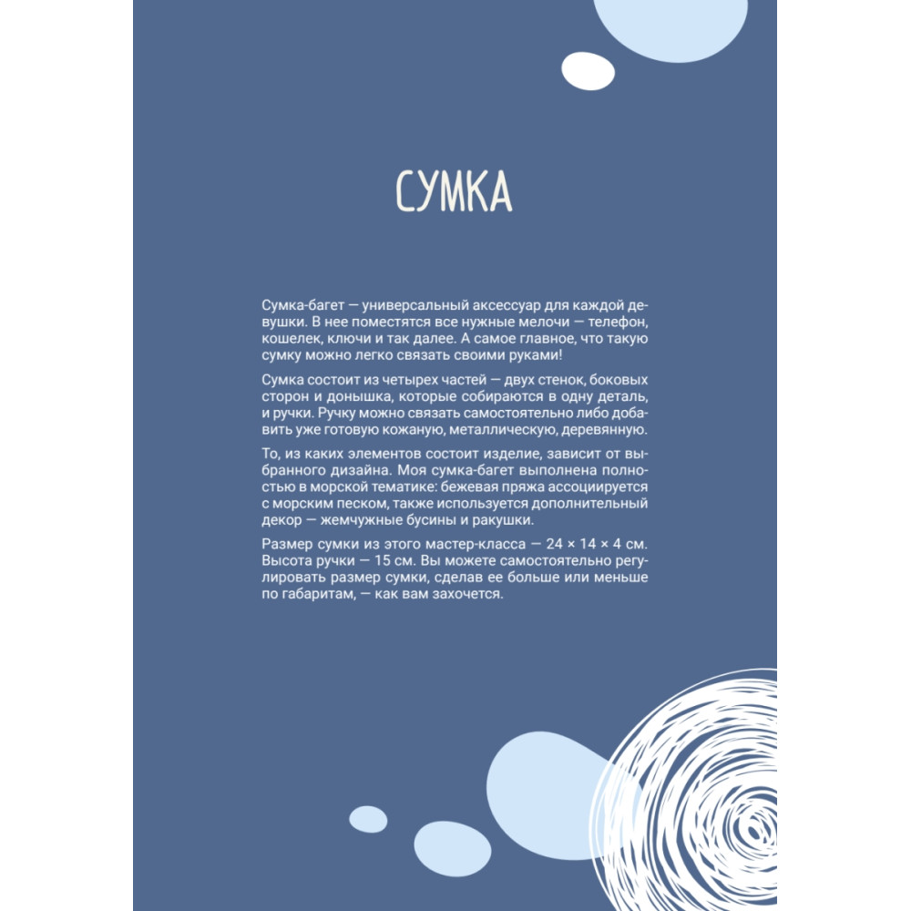 Лето — лучшее время, чтобы поражать всех модными образами. Но только представьте, сколько комплиментов вы получите, когда выйдете на прогулку или на пляж в наряде, созданном своими руками! Стать центром всеобщего внимания вам помогут эта книга и ее автор Дарина luna made, блогер и опытная вязальщица. Дарина покажет вам, что даже при помощи основных техник вязания крючком и спицами можно создать стильные, яркие и трендовые вещи: костюм из юбки и жилетки, панаму, сумку и серьги. Каждый из четырех мастер-классов — это подробная инструкция с пошаговыми фото, в которой учтено все, начиная с выбора инструментов и материалов, детального разбора основных столбиков и петель и заканчивая вариантами финального декора изделий. Начинающим вязальщицам эта книга поможет сделать первые уверенные шаги, а опытным подарит новые идеи и вдохновение для творчества. Задайте свой тренд этому лету!