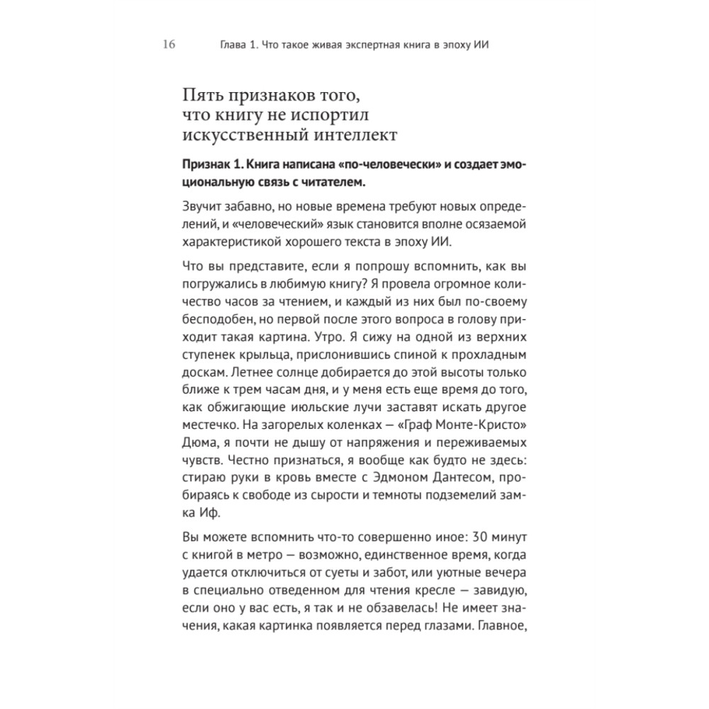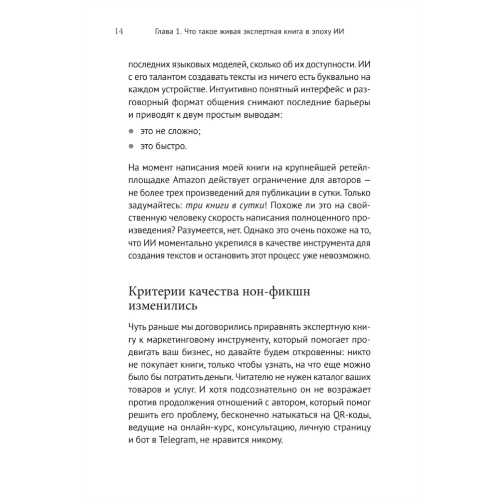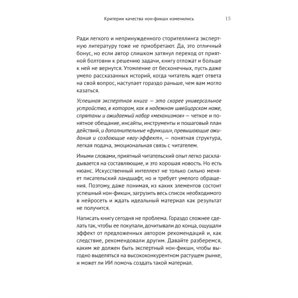 Эта книга поможет экспертам и предпринимателям усилить личный бренд, гострайтерам и издателям — освоить востребованный навык работы с нейросетями, а всем, кто уже знаком с ИИ — взглянуть на него как на партнёра в создании качественного нон-фикшн. Написать экспертную книгу стало проще и быстрее. Теперь вы точно доведёте начатое до конца.