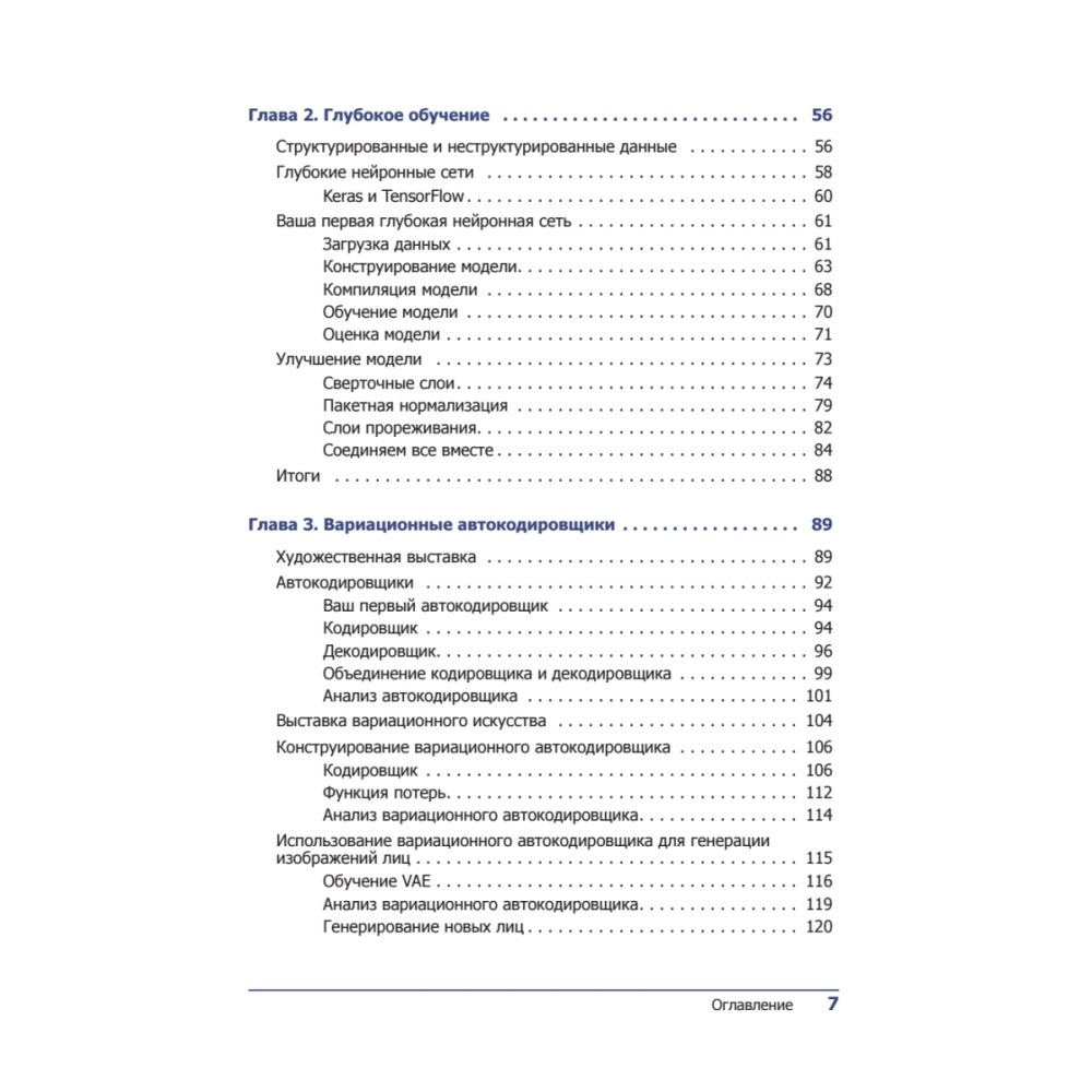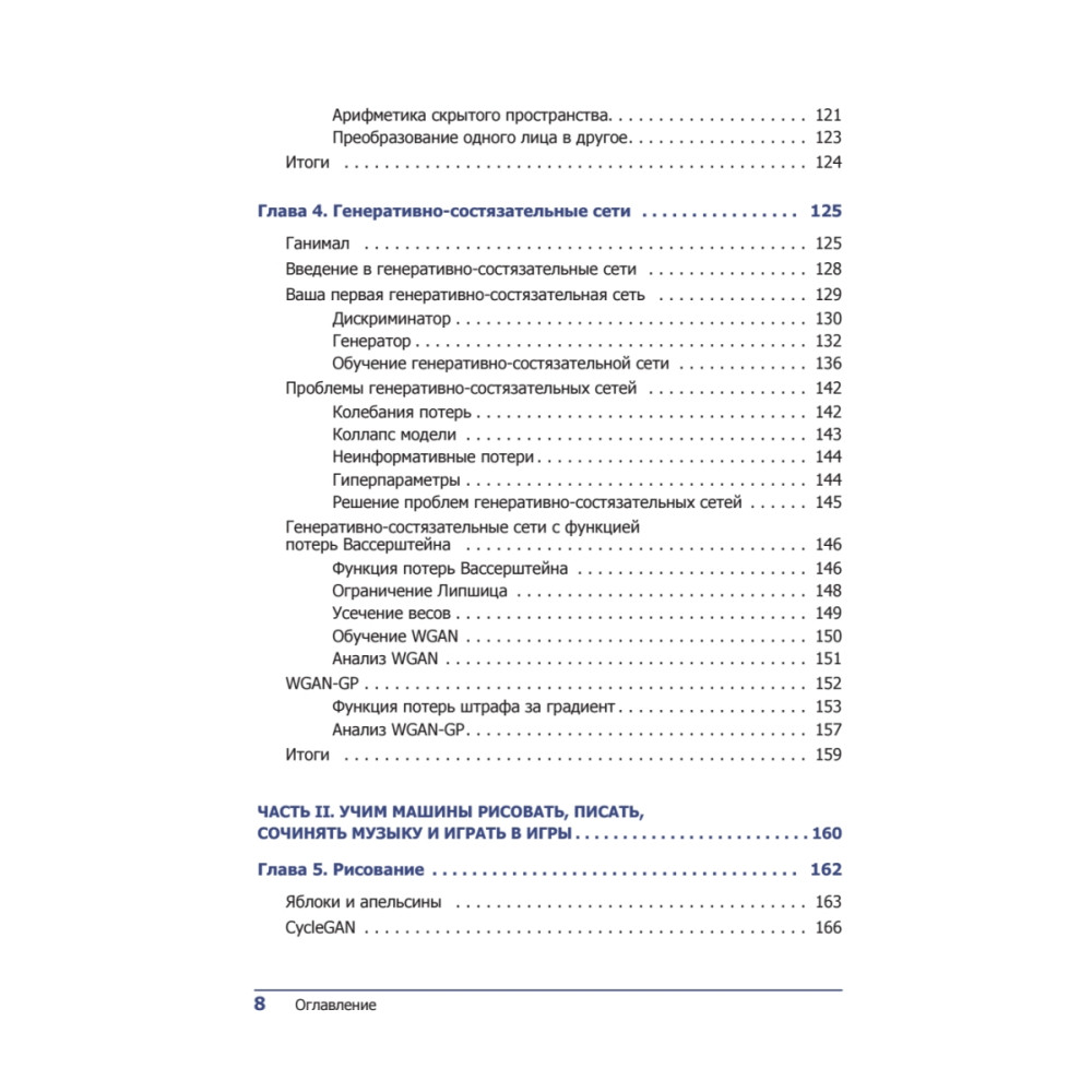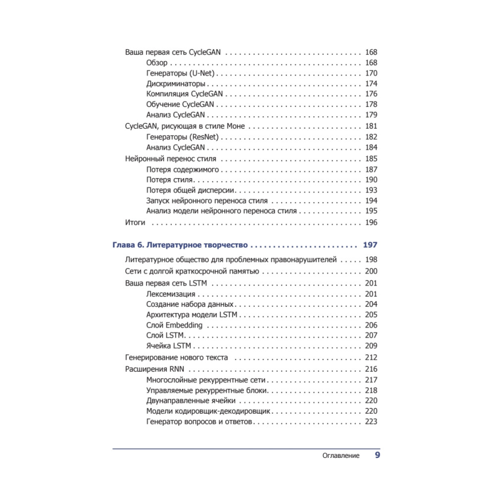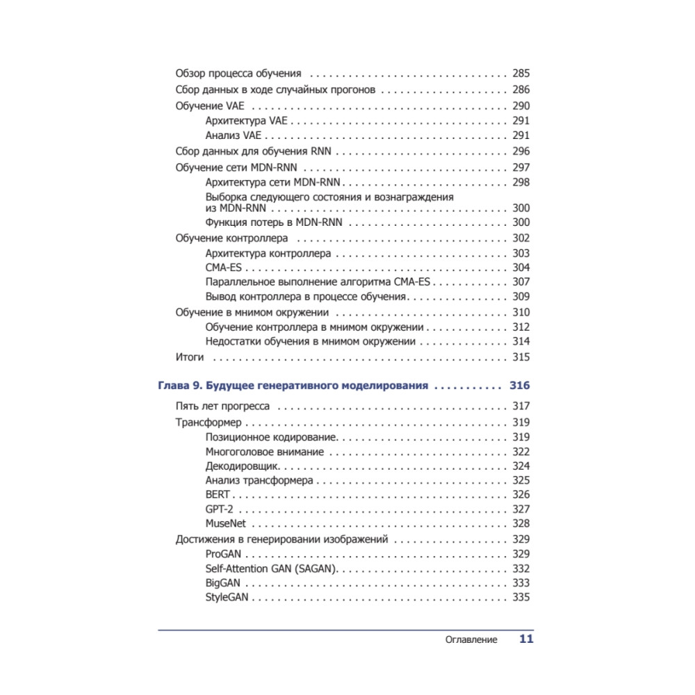 Генеративное моделирование — одна из самых обсуждаемых тем в области искусственного интеллекта. Машины можно научить рисовать, писать и сочинять музыку. Вы сами можете посадить искусственный интеллект за парту или мольберт, для этого достаточно познакомиться с самыми актуальными примерами генеративных моделей глубокого обучения: вариационные автокодировщики, генеративно-состязательные сети, модели типа кодер-декодер и многое другое. Дэвид Фостер делает понятными и доступными архитектуру и методы генеративного моделирования, его советы и подсказки сделают ваши модели более творческими и эффективными в обучении. Вы начнете с основ глубокого обучения на базе Keras, а затем перейдете к самым передовым алгоритмам. - Разберитесь с тем, как вариационные автокодировщики меняют эмоции на фотографиях - Создайте сеть GAN с нуля - Освойте работу с генеративные моделями генерации текста - Узнайте, как генеративные модели помогают агентам выполнять задачи в рамках обучения с подкреплением - Изучите BERT, GPT-2, ProGAN, StyleGAN и многое другое.