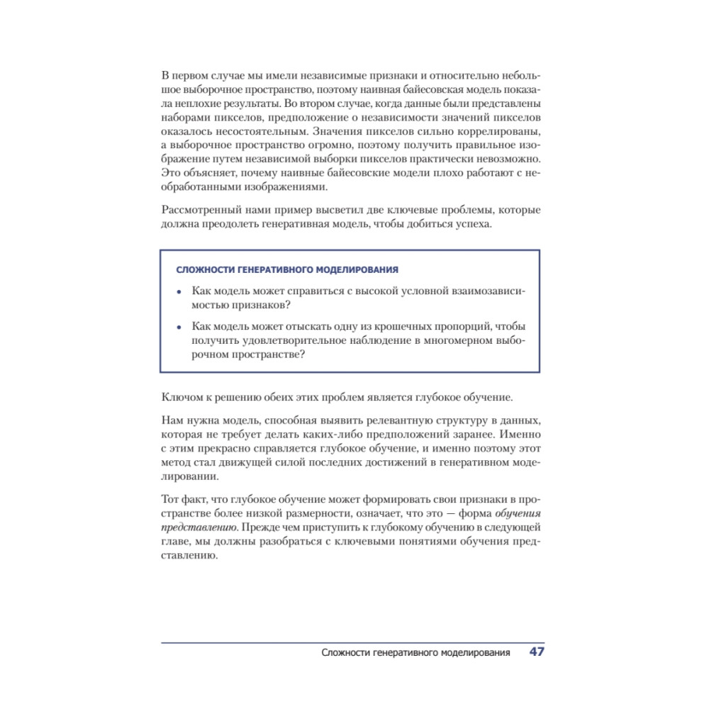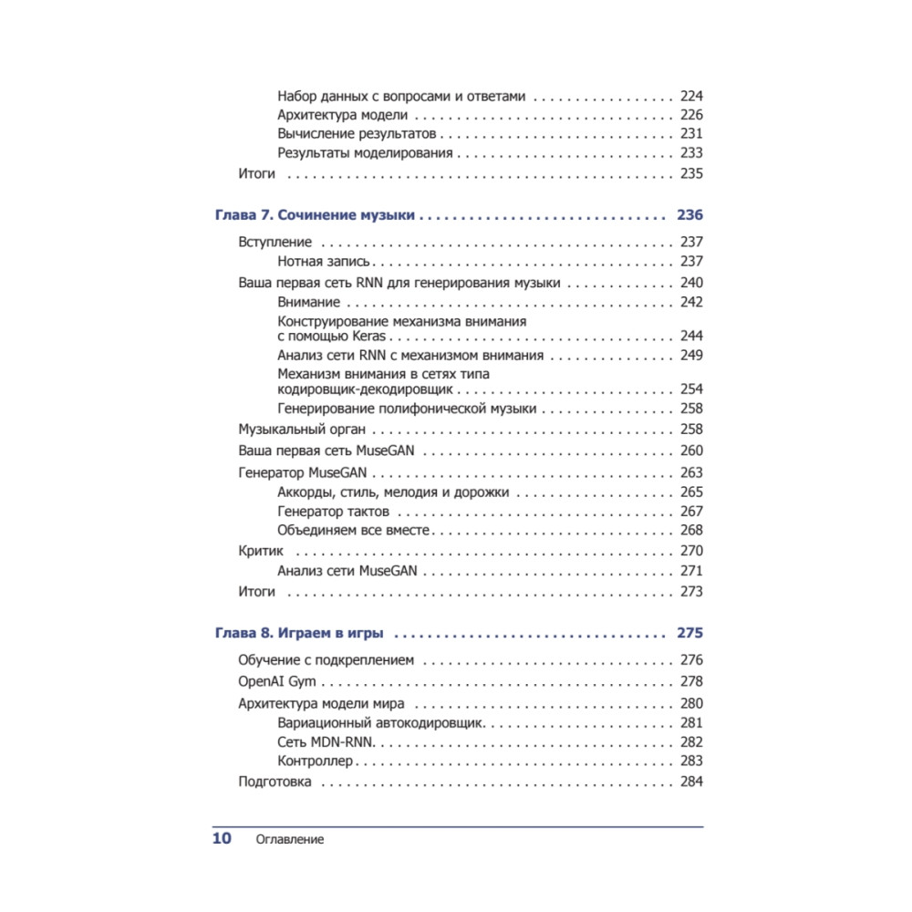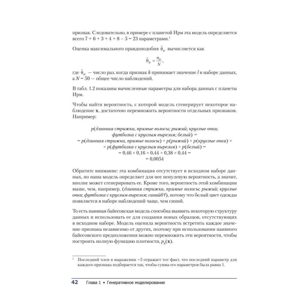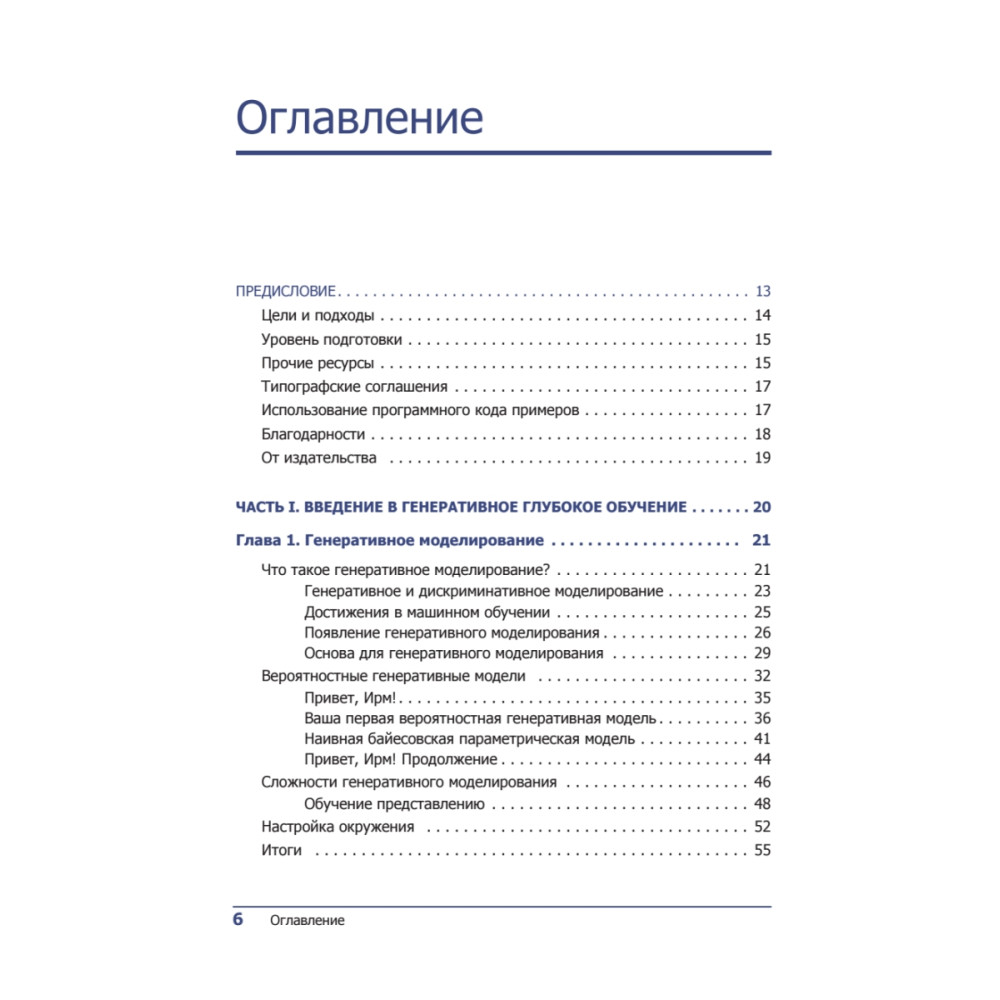 Генеративное моделирование — одна из самых обсуждаемых тем в области искусственного интеллекта. Машины можно научить рисовать, писать и сочинять музыку. Вы сами можете посадить искусственный интеллект за парту или мольберт, для этого достаточно познакомиться с самыми актуальными примерами генеративных моделей глубокого обучения: вариационные автокодировщики, генеративно-состязательные сети, модели типа кодер-декодер и многое другое. Дэвид Фостер делает понятными и доступными архитектуру и методы генеративного моделирования, его советы и подсказки сделают ваши модели более творческими и эффективными в обучении. Вы начнете с основ глубокого обучения на базе Keras, а затем перейдете к самым передовым алгоритмам. - Разберитесь с тем, как вариационные автокодировщики меняют эмоции на фотографиях - Создайте сеть GAN с нуля - Освойте работу с генеративные моделями генерации текста - Узнайте, как генеративные модели помогают агентам выполнять задачи в рамках обучения с подкреплением - Изучите BERT, GPT-2, ProGAN, StyleGAN и многое другое.