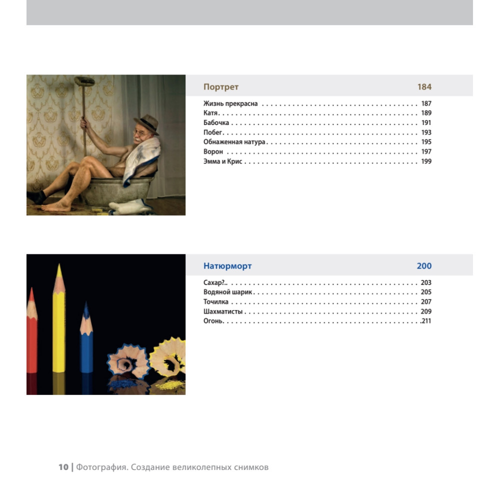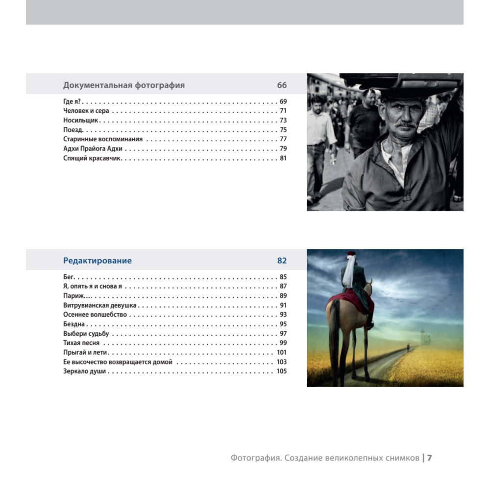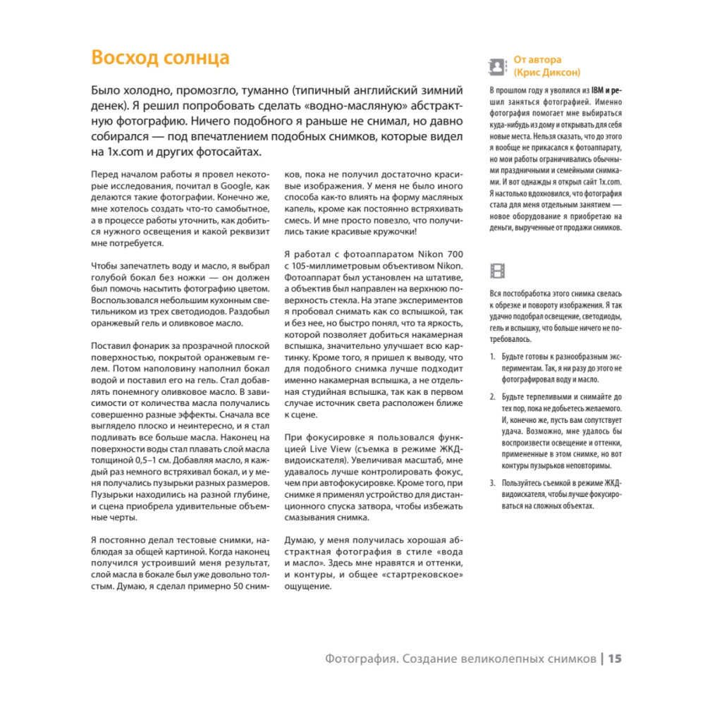 Эта книга уникальна тем, что в ее создании приняло участие 100 фотографов со всего мира. Все фотографии являются произведением искусства и сняты в различных жанрах — документальные, уличная съемка, пейзажи, портреты, художественная фотография и многое другое. Автор каждой работы подробно рассказывает о всех технических секретах от идеи и места съемки до реализации с подробным описанием настроек фотоаппарата, фокусного расстояния, диафрагмы, выдержки, ISO и т. д. Структура издания позволяет изучать его с любой главы: выберите понравившуюся фотографию и узнайте в подробностях, как она была снята и обработана. Прочитав книгу, вы получите огромное количество вдохновляющих советов для создания собственных уникальных иллюстраций. Фотографии для книги были отобраны на популярном сайте www.1x.com, который имеет 150 000 уникальных посещений в день. 1x.com — сообщество профессиональных фотографов со всего мира. На сайте представлены тысячи уникальных снимков, сделанных талантливыми фото-мастерами.