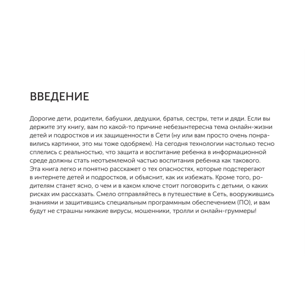 Дорогие дети, родители, бабушки, дедушки, братья, сестры, тети и дяди. Если вы держите эту книгу, вам по какой-то причине небезынтересна тема онлайн-жизни детей и подростков и их защищенности в сети (ну или вам просто очень понравились картинки, это мы тоже одобряем. На сегодня технологии настолько тесно сплелись с реальностью, что защита и воспитание ребенка в информационной среде должны стать неотъемлемой частью воспитания ребенка как такового. Эта книга легко и понятно расскажет о тех опасностях, которые подстерегают в интернете детей и подростков и объяснит как их избежать. Кроме того, родителям станет ясно, о чем и в каком ключе стоит поговорить с детьми, о каких рисках им рассказать. Смело отправляйтесь в путешествие в сеть, вооружившись знаниями и защитившись специальным ПО и вам будут не страшны никакие вирусы, мошенники, тролли и онлайн-груммеры! Узнайте больше о защите детей в интернете: kids.kaspersky.ru