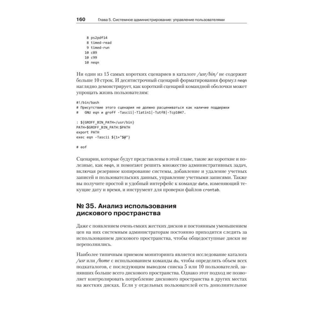 Сценарии командной оболочки помогают системным администраторам и программистам автоматизировать рутинные задачи с тех самых пор, как появились первые компьютеры. С момента выхода первого издания этой книги в 2004 году многое изменилось, однако командная оболочка bash только упрочила свои лидирующие позиции. Поэтому умение использовать все ее возможности становится насущной необходимостью для системных администраторов, инженеров и энтузиастов. В этой книге описываются типичные проблемы, с которыми можно столкнуться, например, при сборке программного обеспечения или координации действий других программ. А решения даются так, что их легко можно взять за основу и экстраполировать на другие схожие задачи. Цель этой книги — продемонстрировать практические приемы программирования сценариев на bash и познакомить с самыми распространенными утилитами на коротких и компактных примерах, не вдаваясь в излишние подробности. Экспериментируйте с этими сценариями — ломайте, исправляйте и приспосабливайте их под свои нужды, чтобы понять, как они работают. Только так вы сможете решать самые сложные задачи.