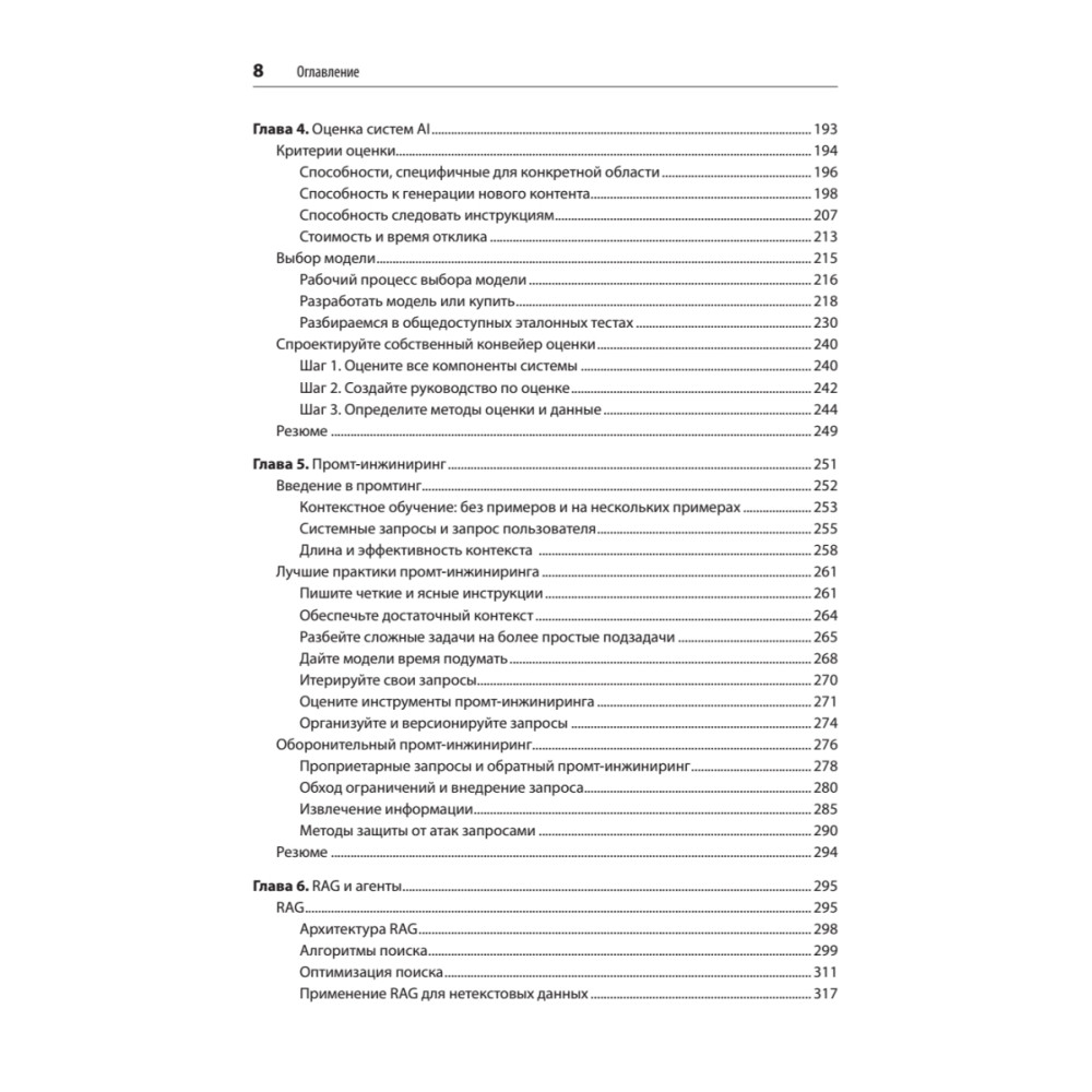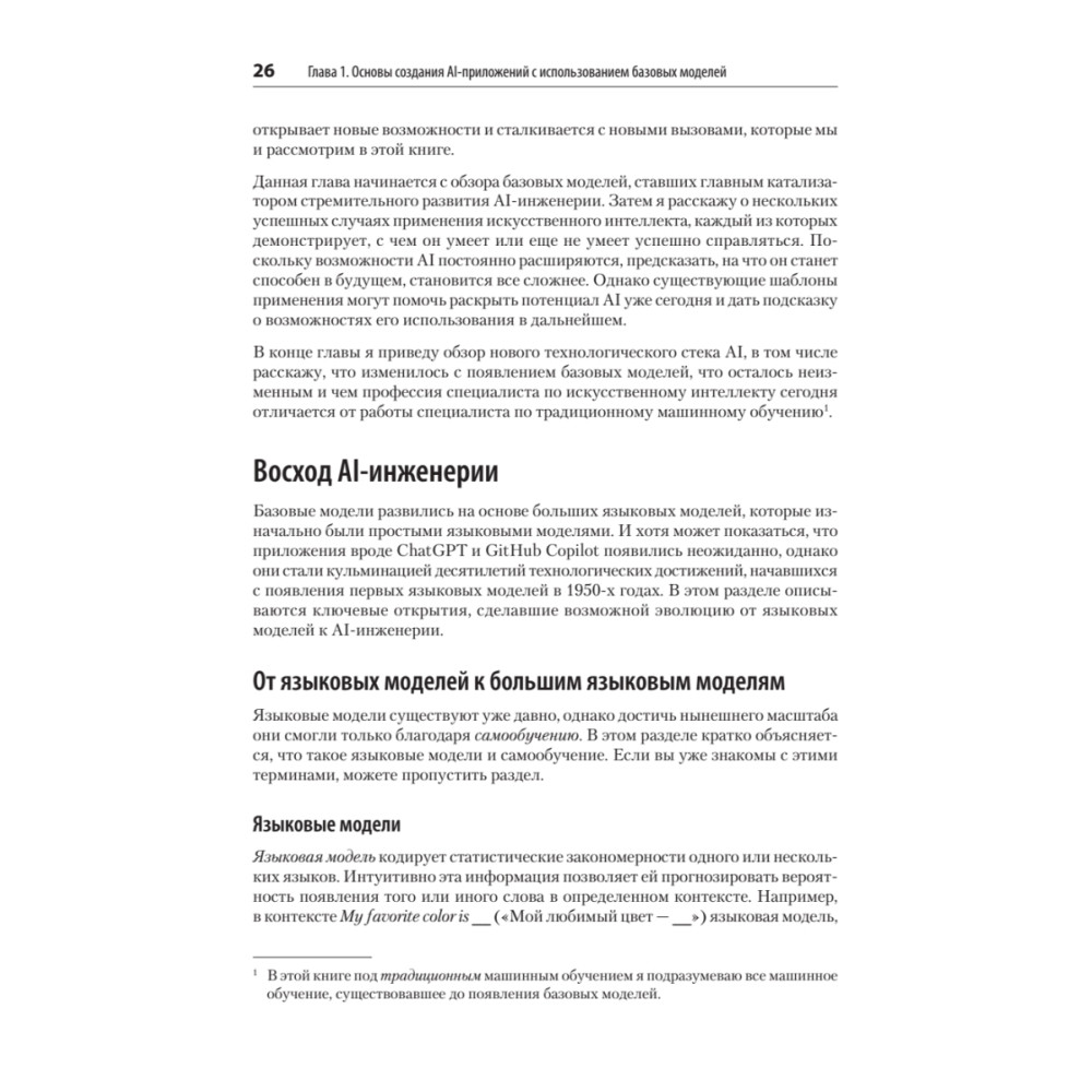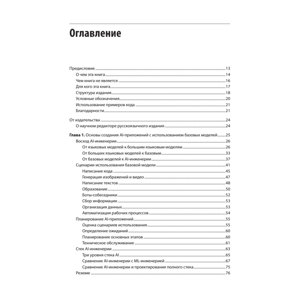 Базовые модели открыли путь множеству новых сценариев применения AI, одновременно снизив входной порог для создания продуктов на основе искусственного интеллекта. Так AI из тайного учения превратился в мощный инструмент разработки, доступный каждому — даже тем, у кого еще нет опыта работы с ним. В этом практическом руководстве Чип Хьюен рассказывает об AI-инженерии — процессе создания приложений на основе готовых базовых моделей. Разработчики таких приложений узнают, как ориентироваться на огромных просторах искусственного интеллекта: научатся разбираться в типах моделей, наборах данных, эталонных тестах для их оценки и, на первый взгляд, бесконечном множестве шаблонов приложений. В книге также представлена практическая методика разработки приложения на основе AI и его эффективного развертывания.