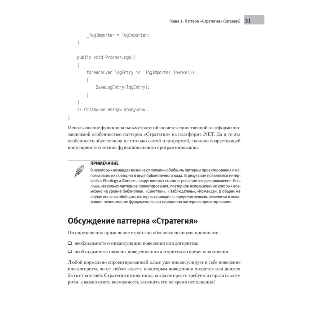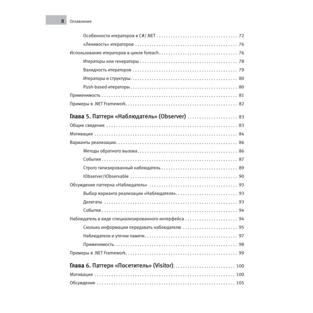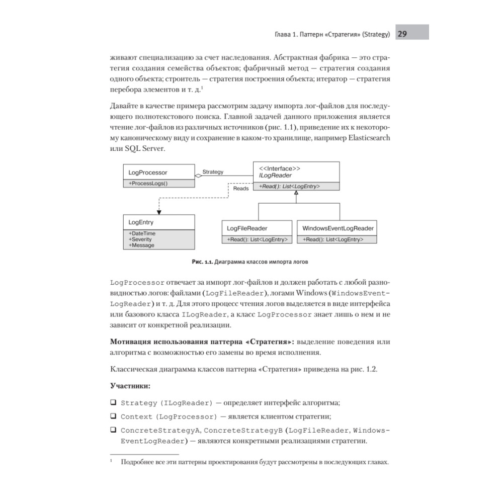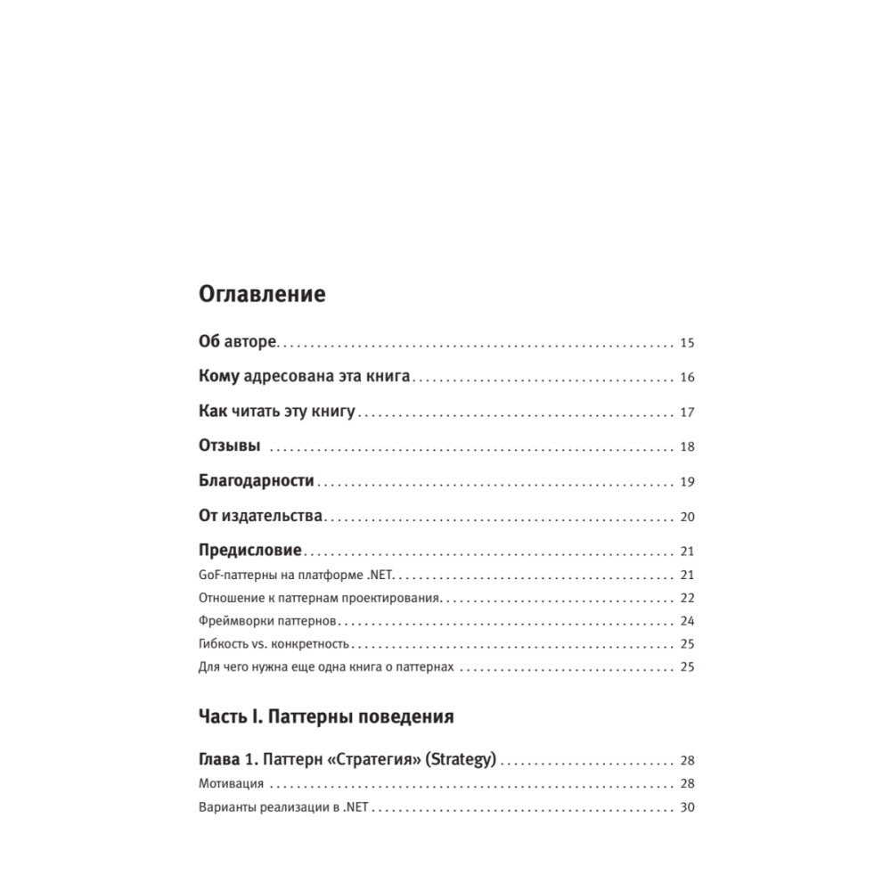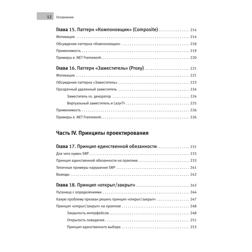 Паттерны проектирования остаются важным инструментом в арсенале разработчика, поскольку они опираются на фундаментальные принципы проектирования. Тем не менее, появление новых конструкций в современных языках программирования делает одни паттерны более важными, а значимость других сводит к минимуму. Цель данной книги — показать, как изменились паттерны проектирования за это время, как на них повлияло современное увлечение функциональным программированием, и объяснить, каким образом они используются в современных .NET-приложениях. В издании вы найдете подробное описание классических паттернов проектирования с особенностями их реализации на платформе .NET, а также примеры их использования в .NET Framework. Вы также изучите принципы проектирования, известные под аббревиатурой SOLID, и научитесь применять их при разработке собственных приложений. Книга предназначена для профессиональных программистов, которые хотят изучить особенности классических принципов и паттернов программирования с примерами на языке C# и понять их роль в разработке современных приложений на платформе .NET.