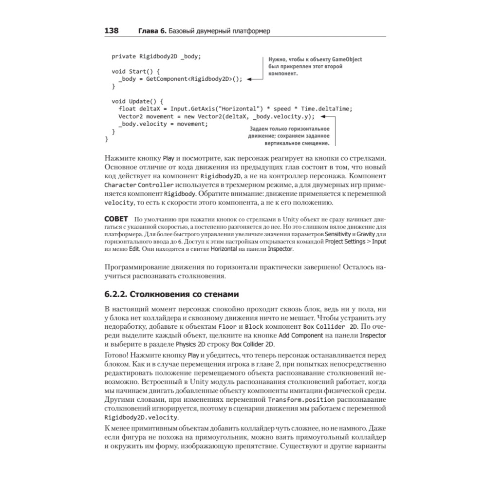 Второе издание знаменитого бестселлера "Unity в действии" было полностью переработано, чтобы познакомить вас с новыми подходами и идеями, позволяющими максимально эффективно использовать Unity для разработки игр. Больше внимания уделено проектированию двумерных игр, фундаментальные концепции которых читатель может применить на практике и построить сложный двумерный платформер. Эту книгу можно смело назвать введением в Unity для профессиональных программистов. Джозеф Хокинг дает людям, имеющим опыт разработки, всю необходимую информацию, которая поможет быстро освоить новый инструмент и приступить к созданию новых игр. А учиться лучше всего на конкретных проектах и практических заданиях.