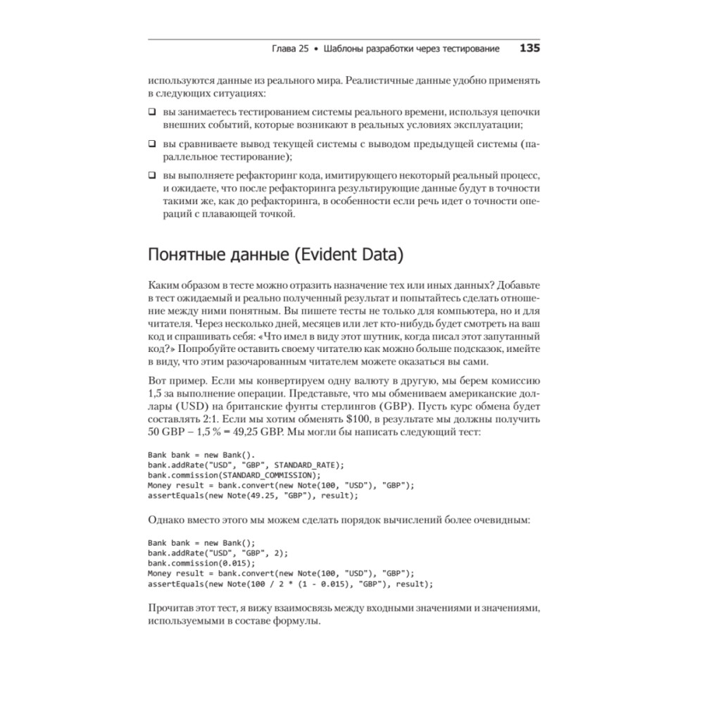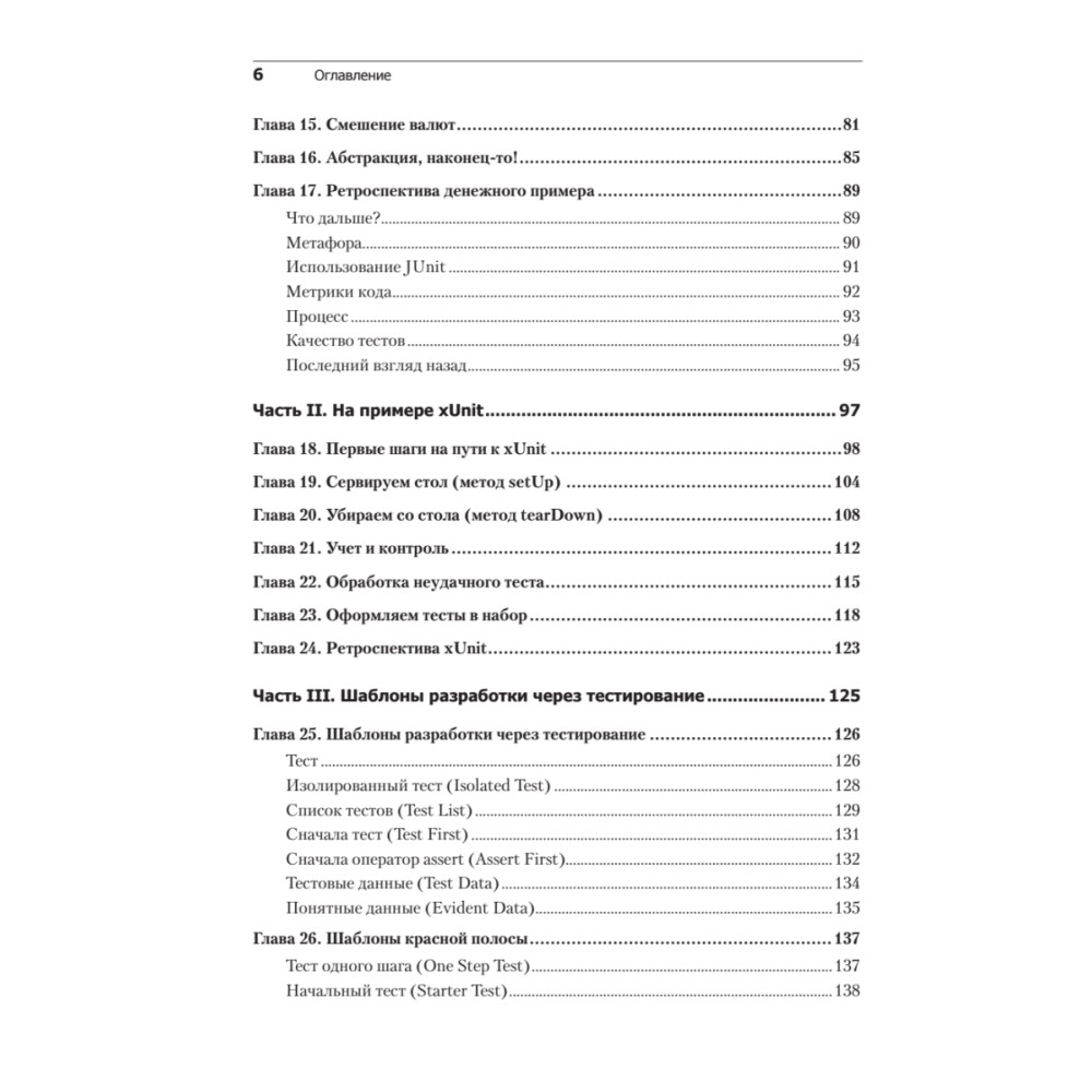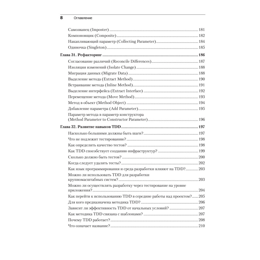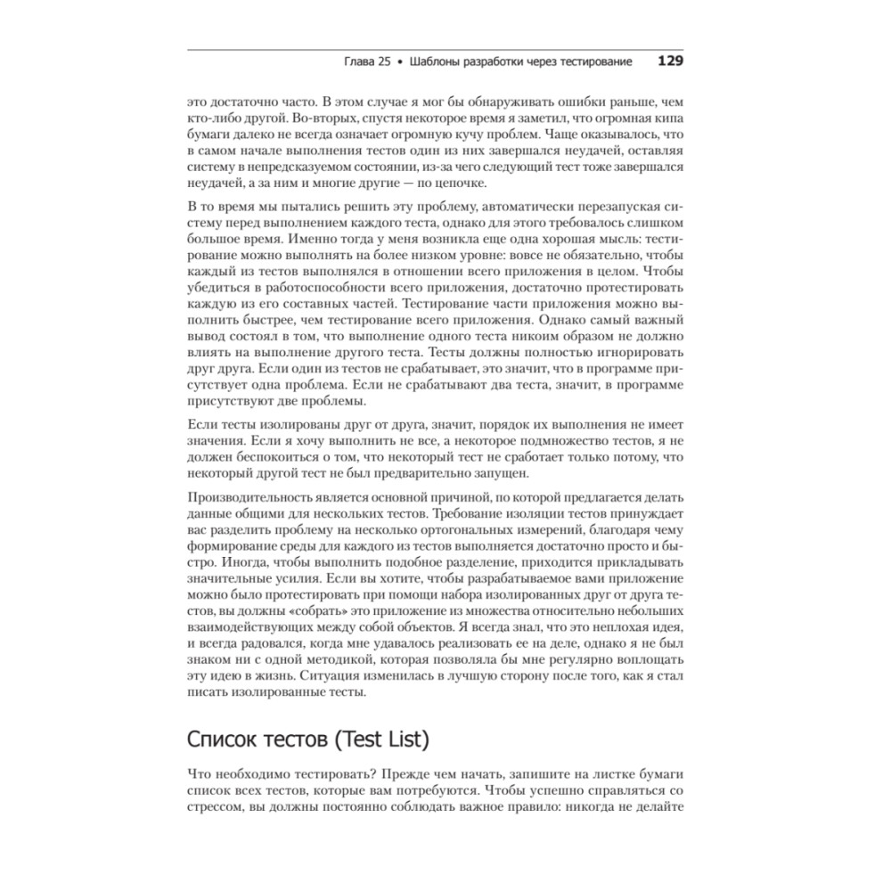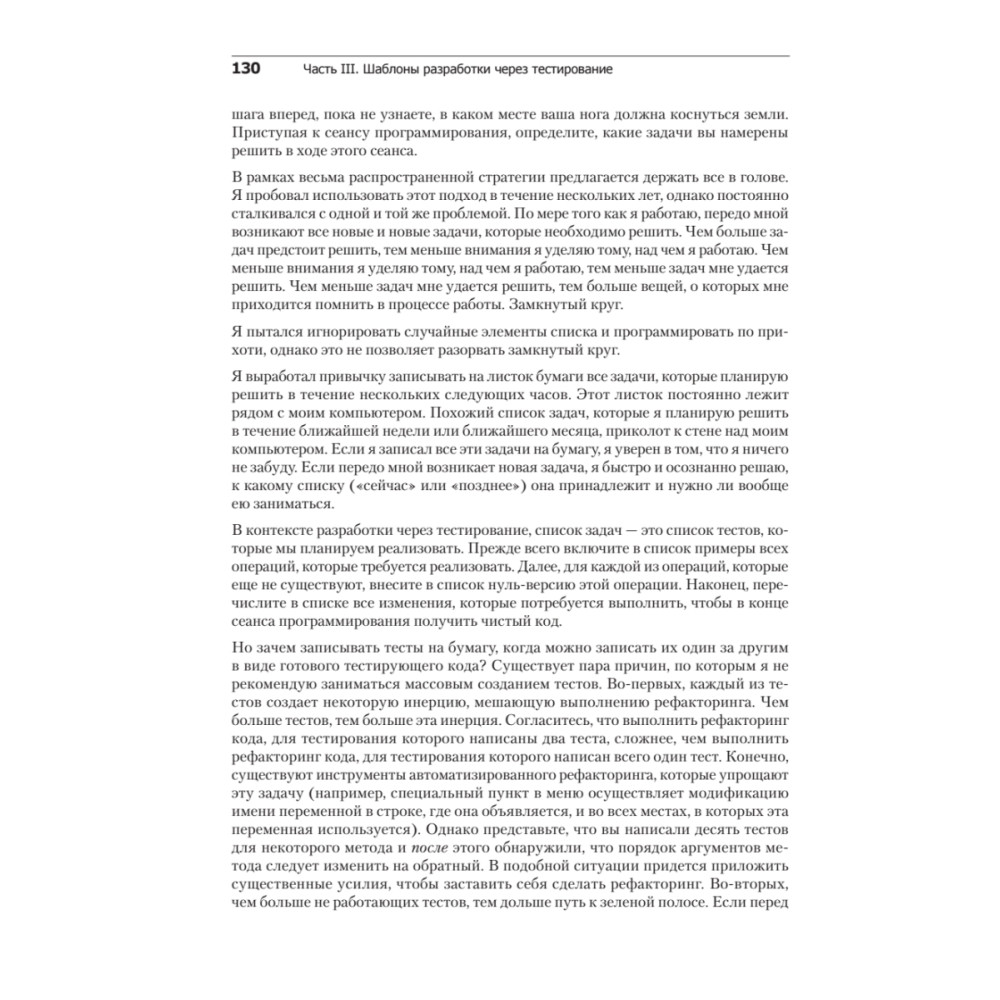 Возвращение знаменитого бестселлера. Изящный, гибкий и понятный код, который легко модифицировать, который корректно работает и который не подкидывает своим создателям неприятных сюрпризов. Неужели подобное возможно? Чтобы достичь цели, попробуйте тестировать программу еще до того, как она написана. Именно такая парадоксальная идея положена в основу методики TDD (Test-Driven-Development — разработка, основанная на тестировании). Бессмыслица? Не спешите делать скороспелые выводы. Рассматривая применение TDD на примере разработки реального программного кода, автор демонстрирует простоту и мощь этой методики. В книге приведены два программных проекта, целиком и полностью реализованных с использованием TDD. За рассмотрением примеров следует обширный каталог приемов работы в стиле TDD, а также паттернов и рефакторингов, имеющих отношение к TDD. Книга будет полезна для любого программиста, желающего повысить производительность своей работы и получить удовольствие от программирования.
